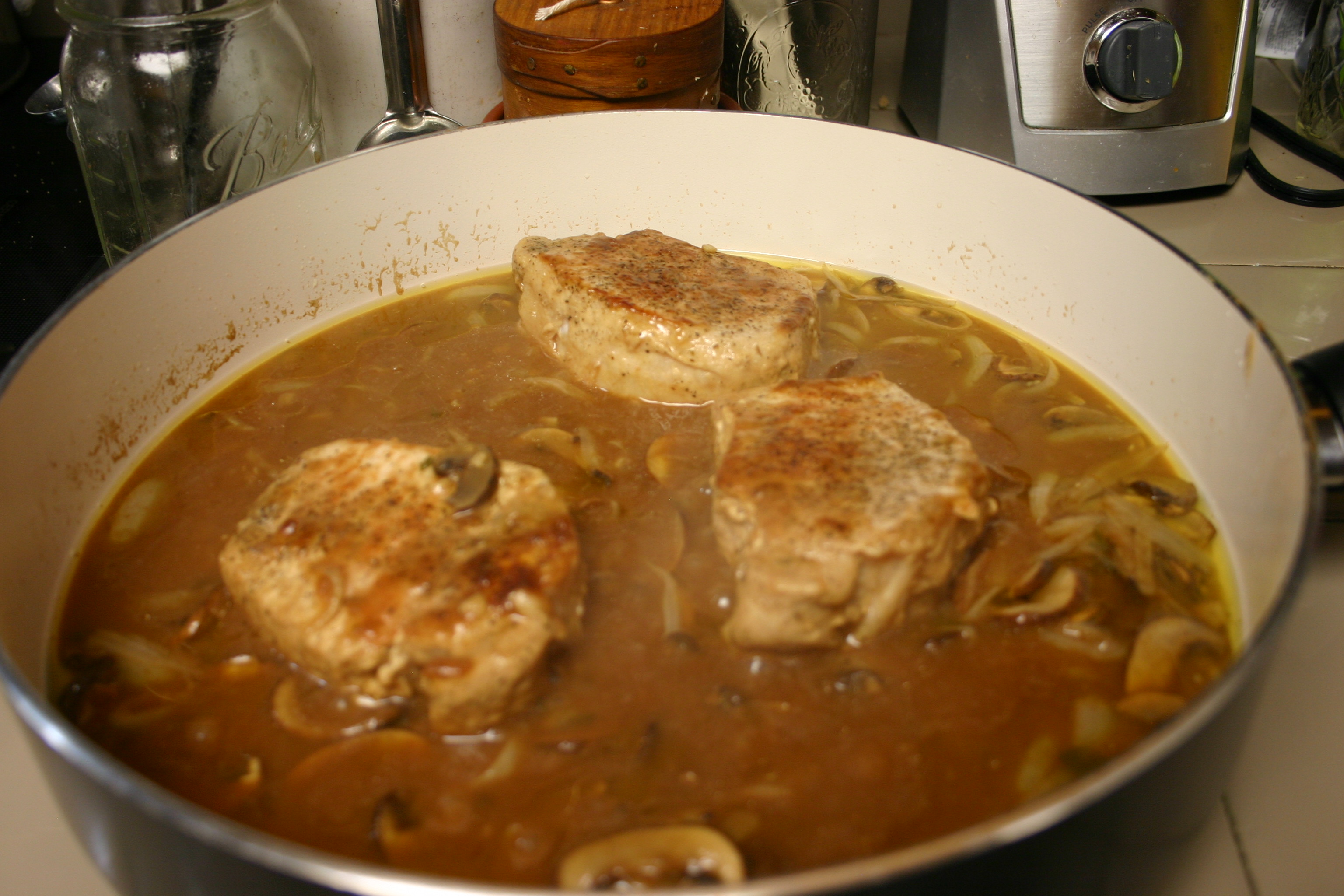 Pour gravy from the saucepan over the pork chops. Cover, return to low heat until pork chops are tender and no longer pink in the center, about 30 minutes or so. While the pork chops simmer, make mashed potatoes for serving.