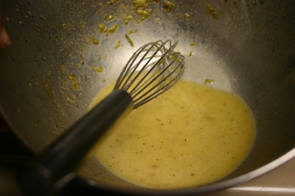 In a slow, steady stream, whisk in the olive oil. Set dressing aside, whisking once more just before serving.