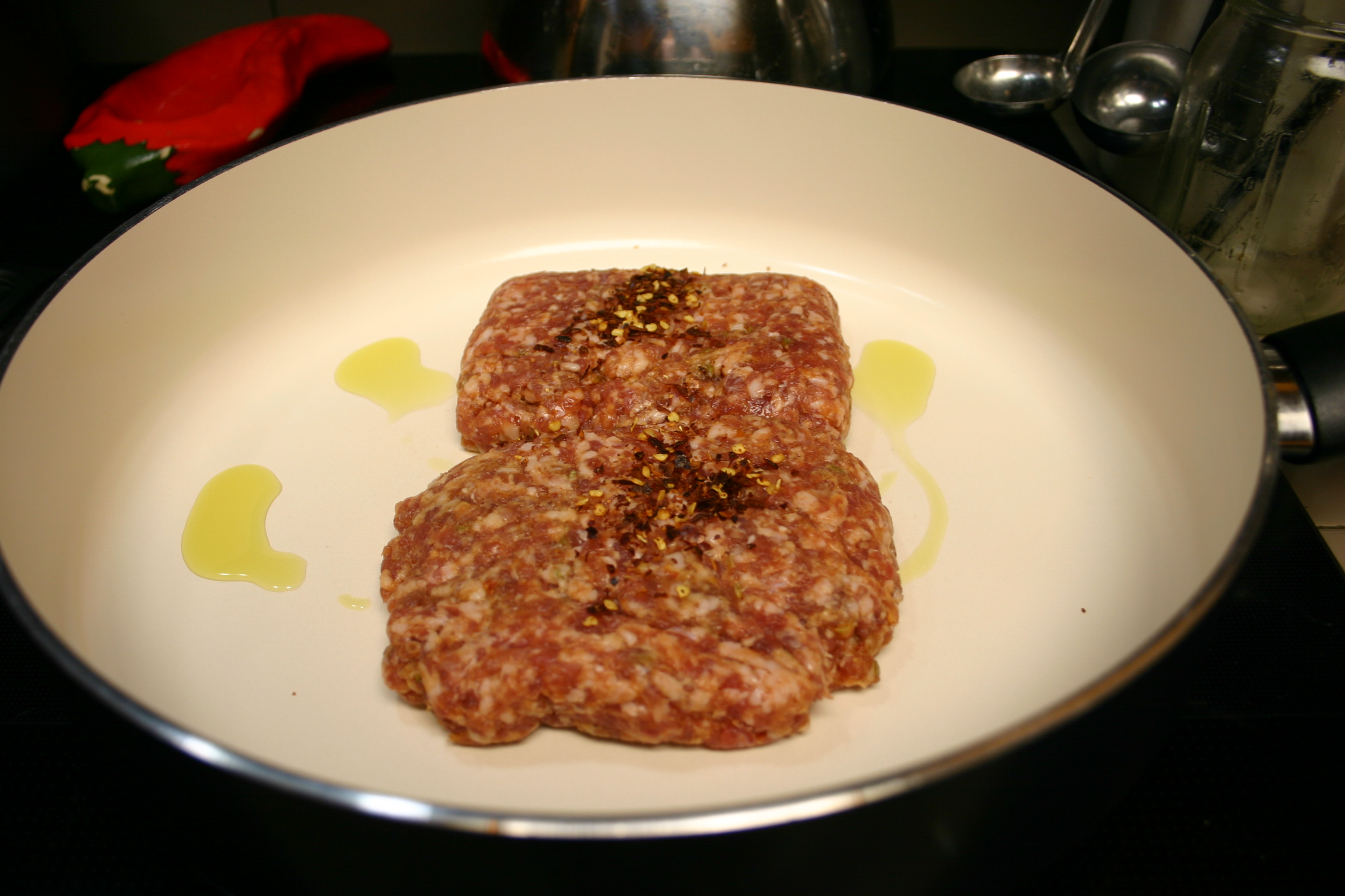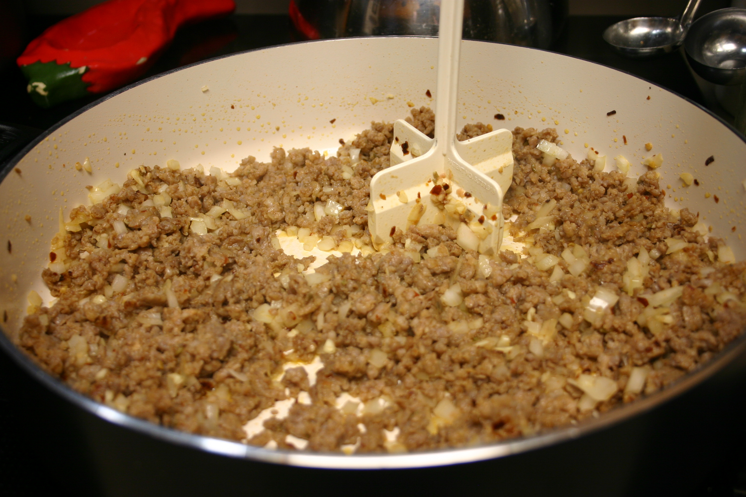 Heat oil in a large, deep skillet over medium heat. Cook sausage seasoned with pepper flakes until sauce is cooked through, breaking into small pieces as it browns.