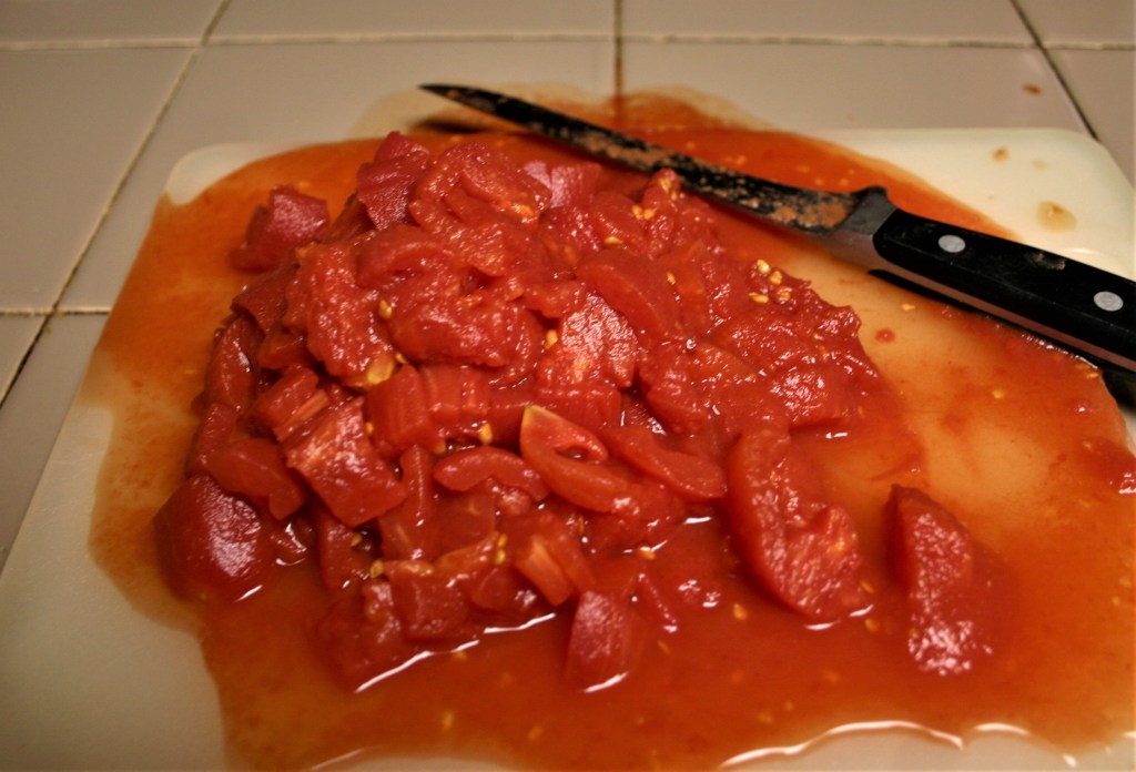 Drain tomatoes of their liquid, reserve tomato juice. Coarsely chop the whole tomatoes, set aside.