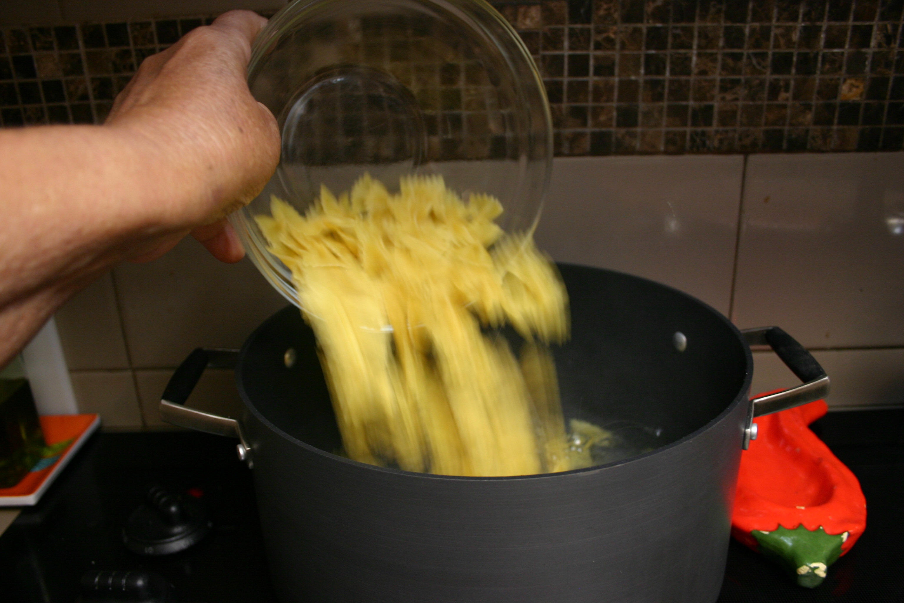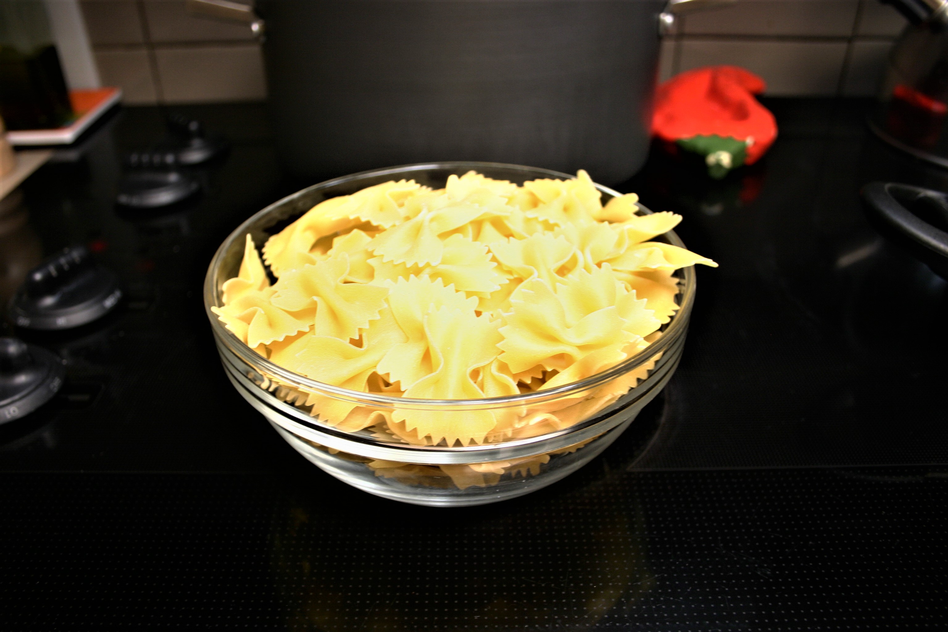 Since this is truly a cooking blog, we aren’t really going to labor too much on the whole ribbon round the neck and focus more on Farfalle Pasta. While we’d like to think that’s Italian for “Bow tie”, it’s not. And the Italian translation is much prettier – Butterfly. Butterfly Pasta. But for the sake of today’s post and National Bow Tie Pasta, we’ll use the American interpretation.