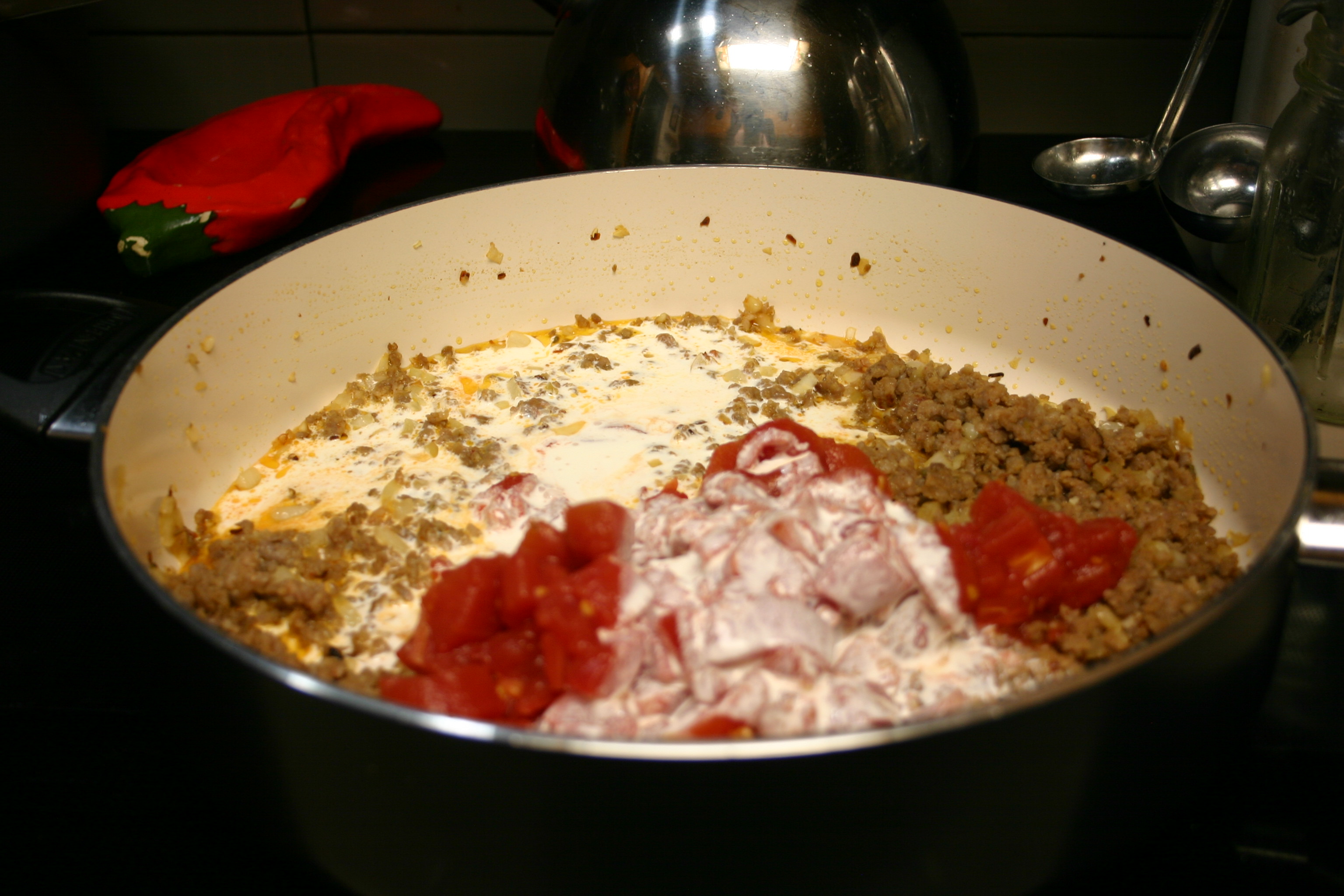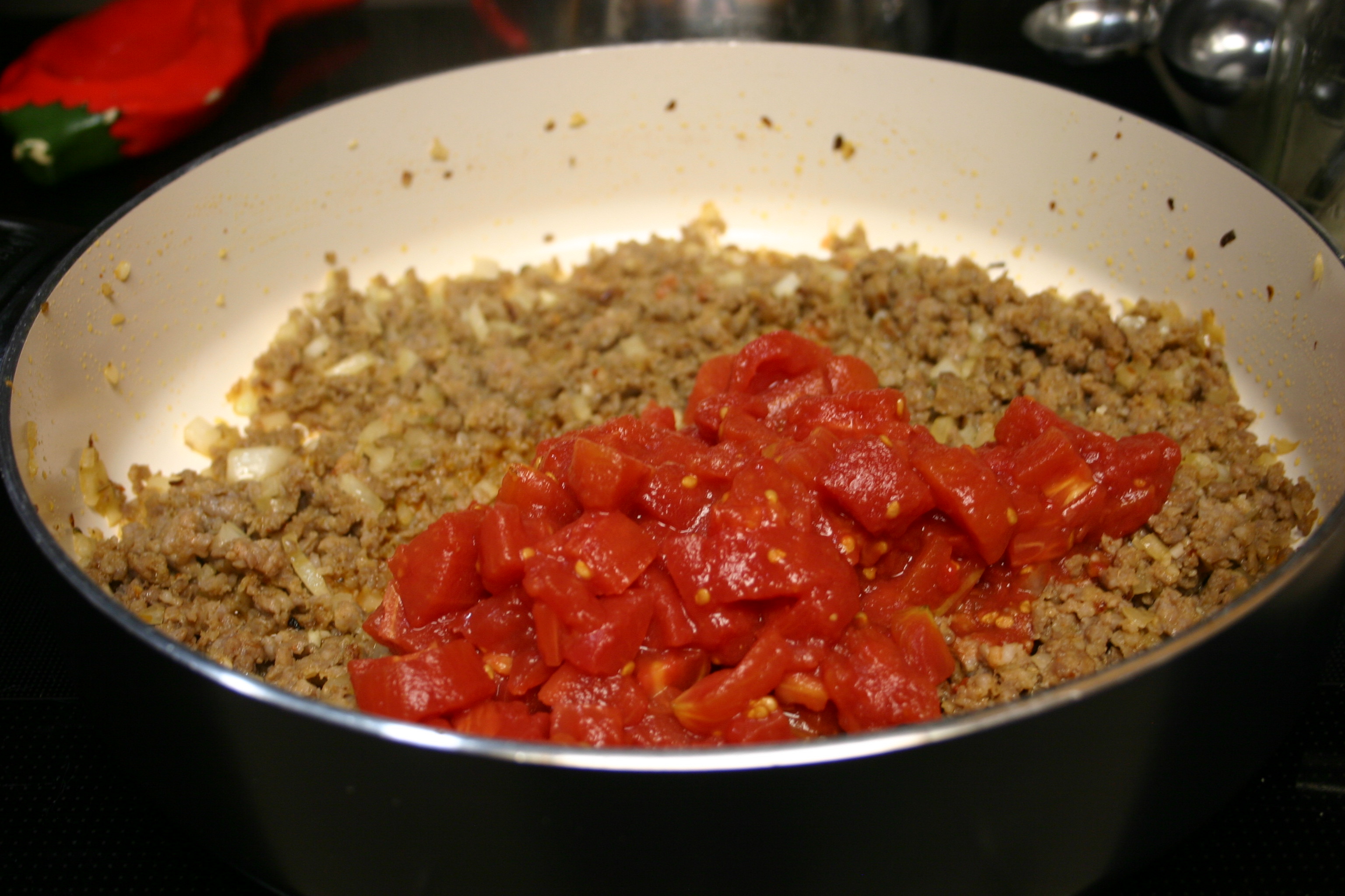Add onions and garlic, cook until onions are tender. Drain meat mixture well, return to skillet. Stir in the tomatoes along with any juices that accumulated on the cutting board, tomato juice and heavy cream. Season with salt. Bring to a simmer, let cook until sauce thickens, about 8 minutes.
