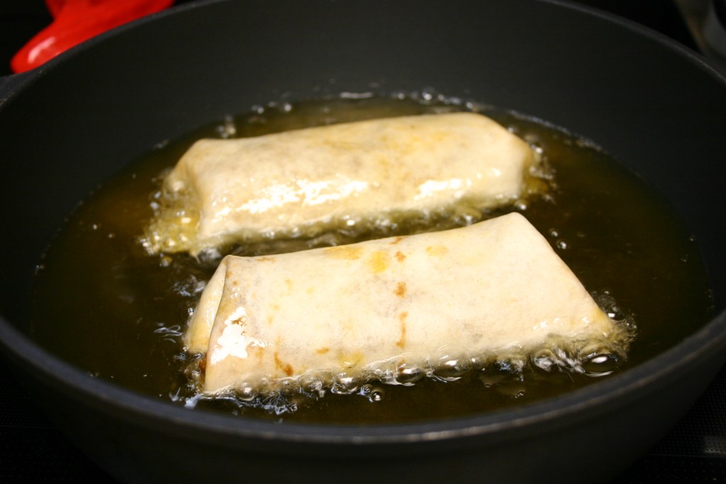 Fry 2 or 3 Chimichangas at a time in the oil for about 2 minutes, beginning seam-side down. Turn gently with a spatula. Remove with the spatula, drain on paper towels. Keep warm in the oven on the prepared baking sheet.