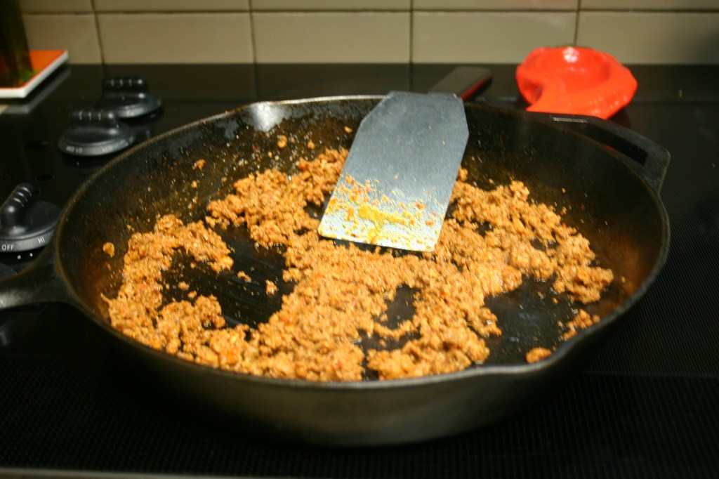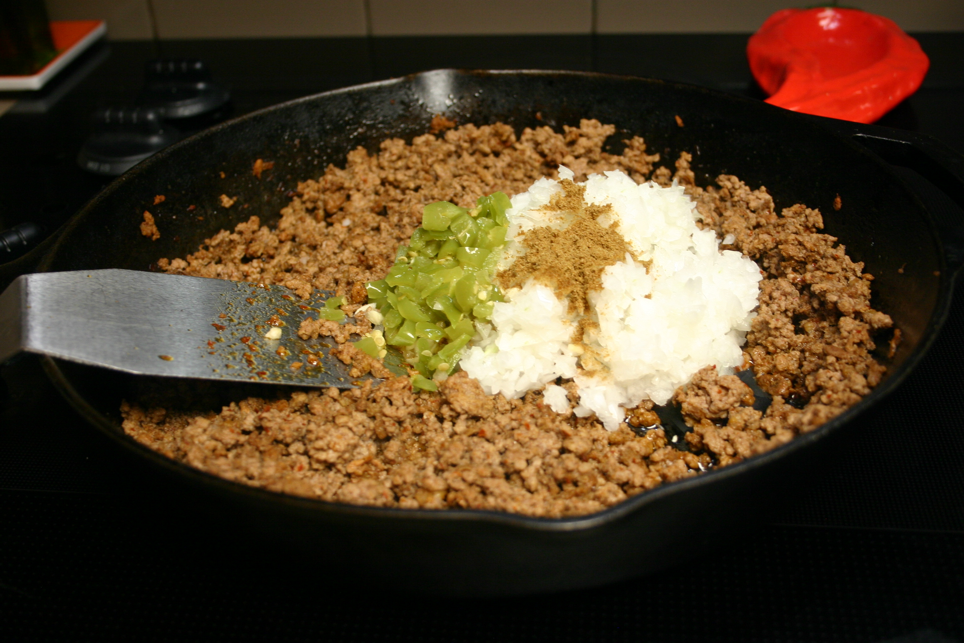 Crumble ground beef into the skillet with the chorizo. Brown for about 8 minutes, breaking apart as it cooks. Add onions, garlic, minced jalapeno and cumin. Cook, stirring often, for about 4 minutes or until the onion is soften. Drain off as much fat as possible.