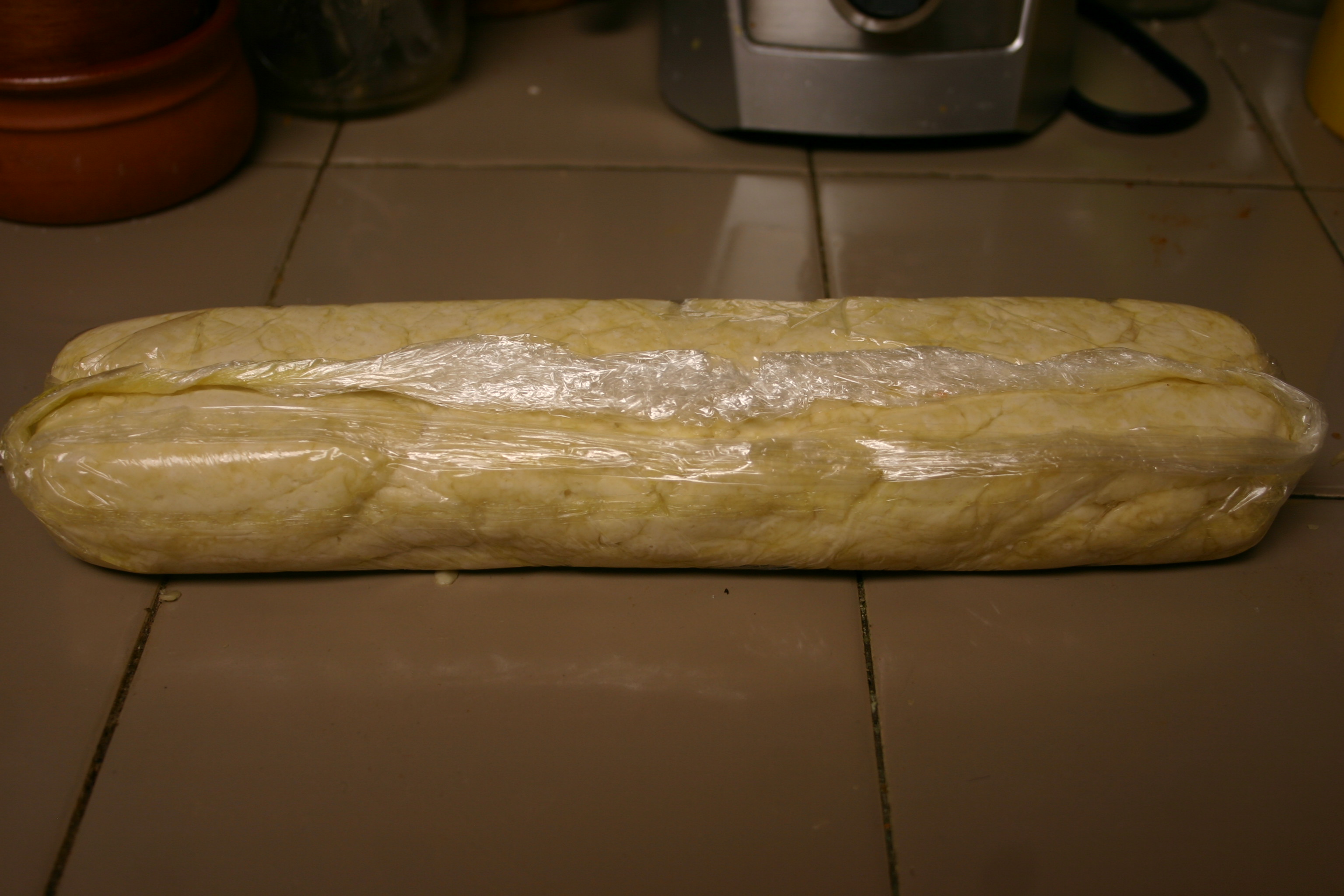 Mix dry ingredients together. With hands, work lard into the flour mixture. Slowly add milk. Place dough on a floured board, knead for 5 minutes. Shape dough into a 10-inch long cylinder, bursh with oil, cover with plastic wrap and let rest for 1 hour.