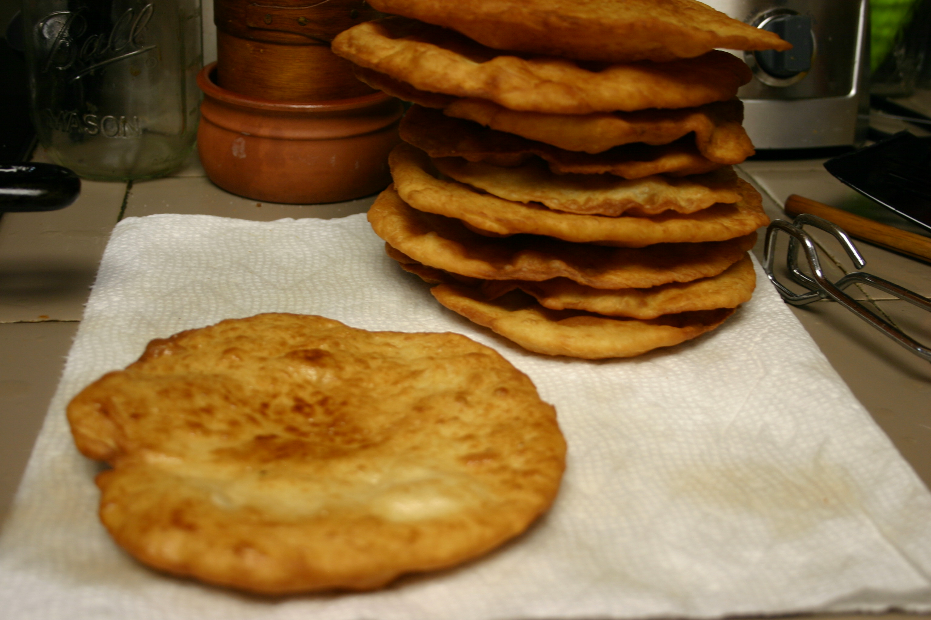 Heat about an inch or so of oil in a large cast iron skillet. Fry the bread disks in the hold oil, one at a time, until golden brown, swirling the disk with a wooden spoon or tongs as it cooks to prevent burning. Flip bread, continue to brown until done. Place on paper towels, blot off excess grease and set aside in a warm oven. Repeat until all the bread has been fried.