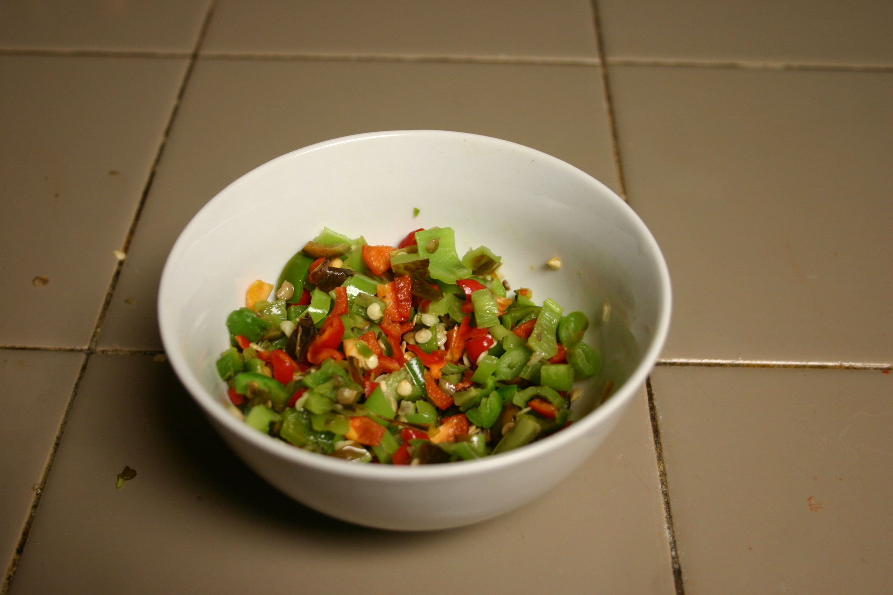 Stem the roasted peppers, dice and place in a small bowl. Stem Scotch Bonnet Peppers, dice and add to the roasted pepper mix. Toss to blend, set aside to use as a spicy garnish.