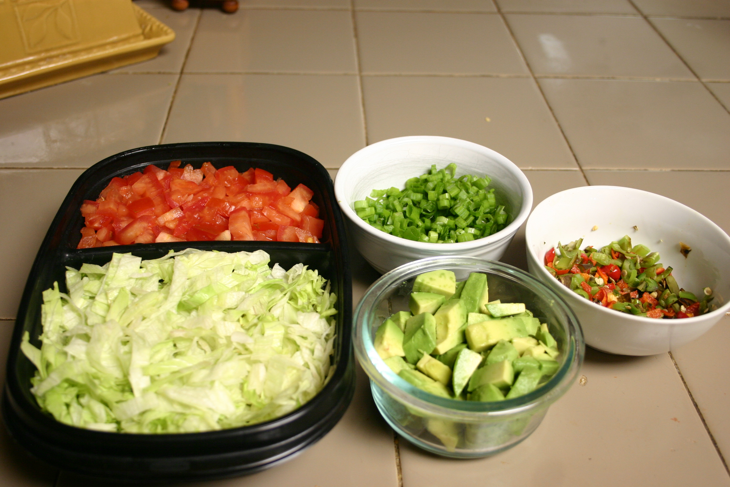Chop tomatoes, shred lettuce and set aside until ready to assemble tacos. Trim roots from the green onions, slice and set aside. Just before serving, peel and dice the avocado.