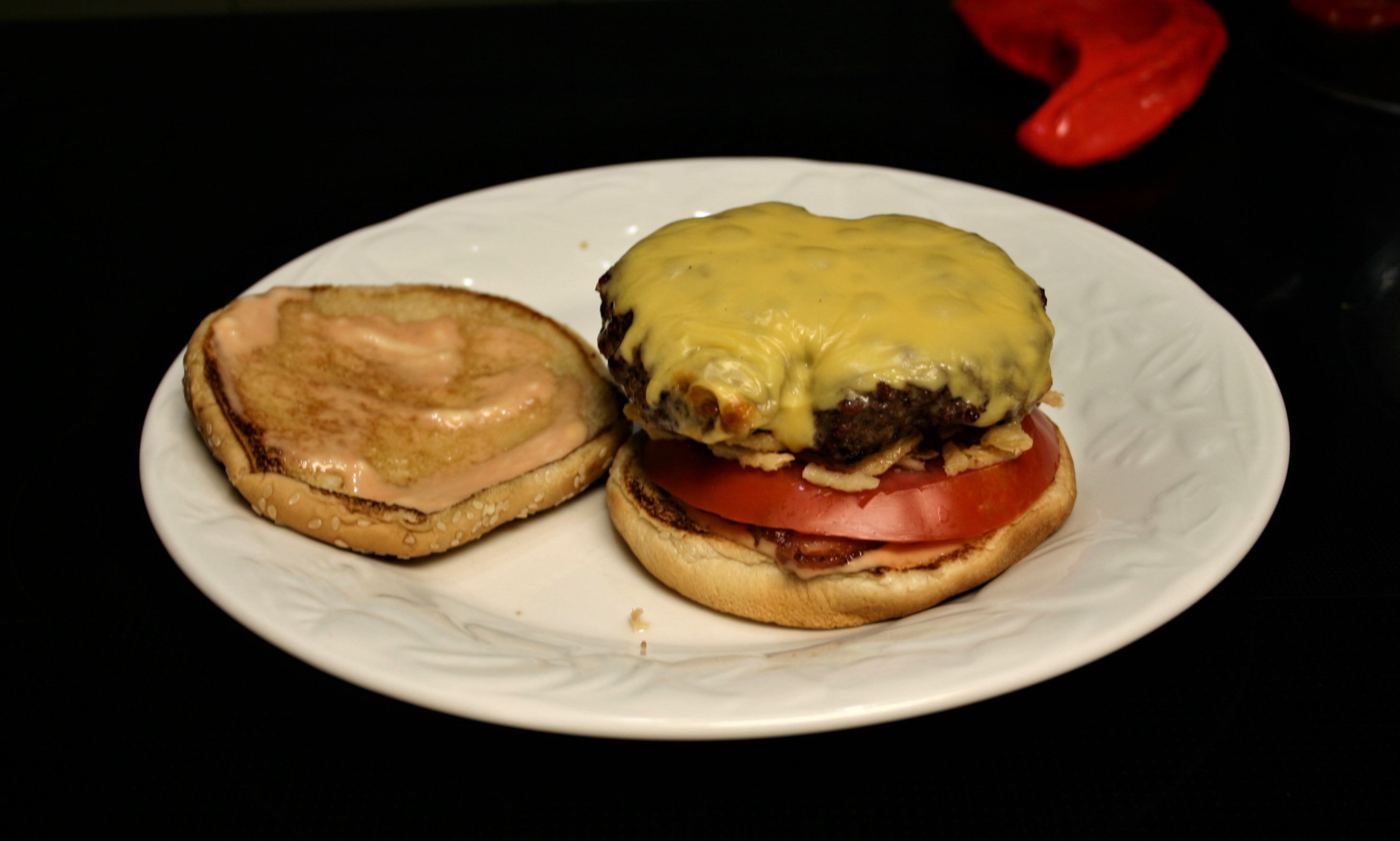 Split hamburger buns, lightly toast. Spread fry sauce on the inside of both the top and bottom bun. Top the bottom but with bacon, tomato and fried onions.