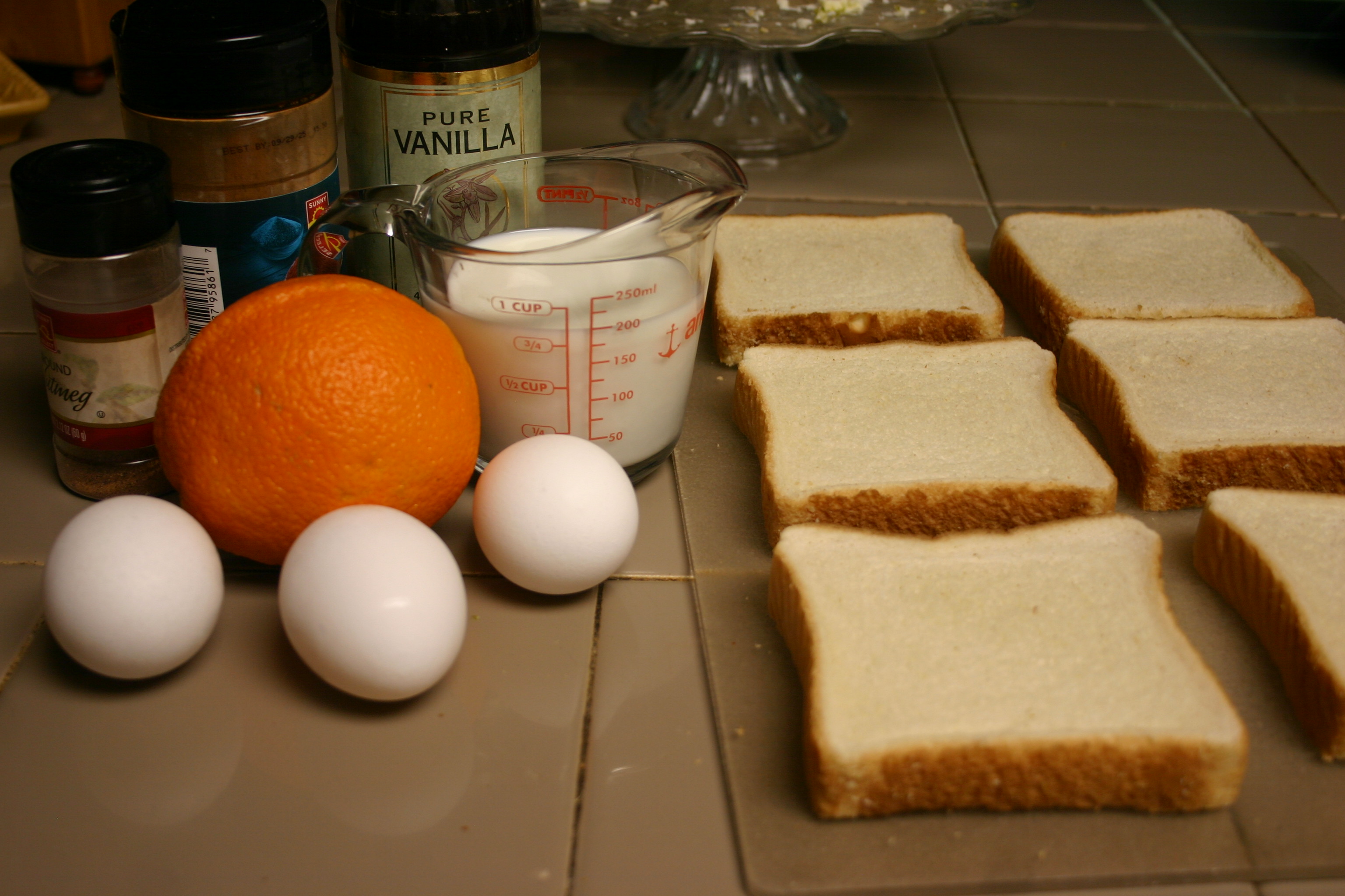 Lay bread out on a cutting board to “dry” slightly. While the bread dries, zest the orange, set zest aside. Cut orange in half, juice into a measuring cup. Add additional orange juice as necessary to measure one-quarter cup.