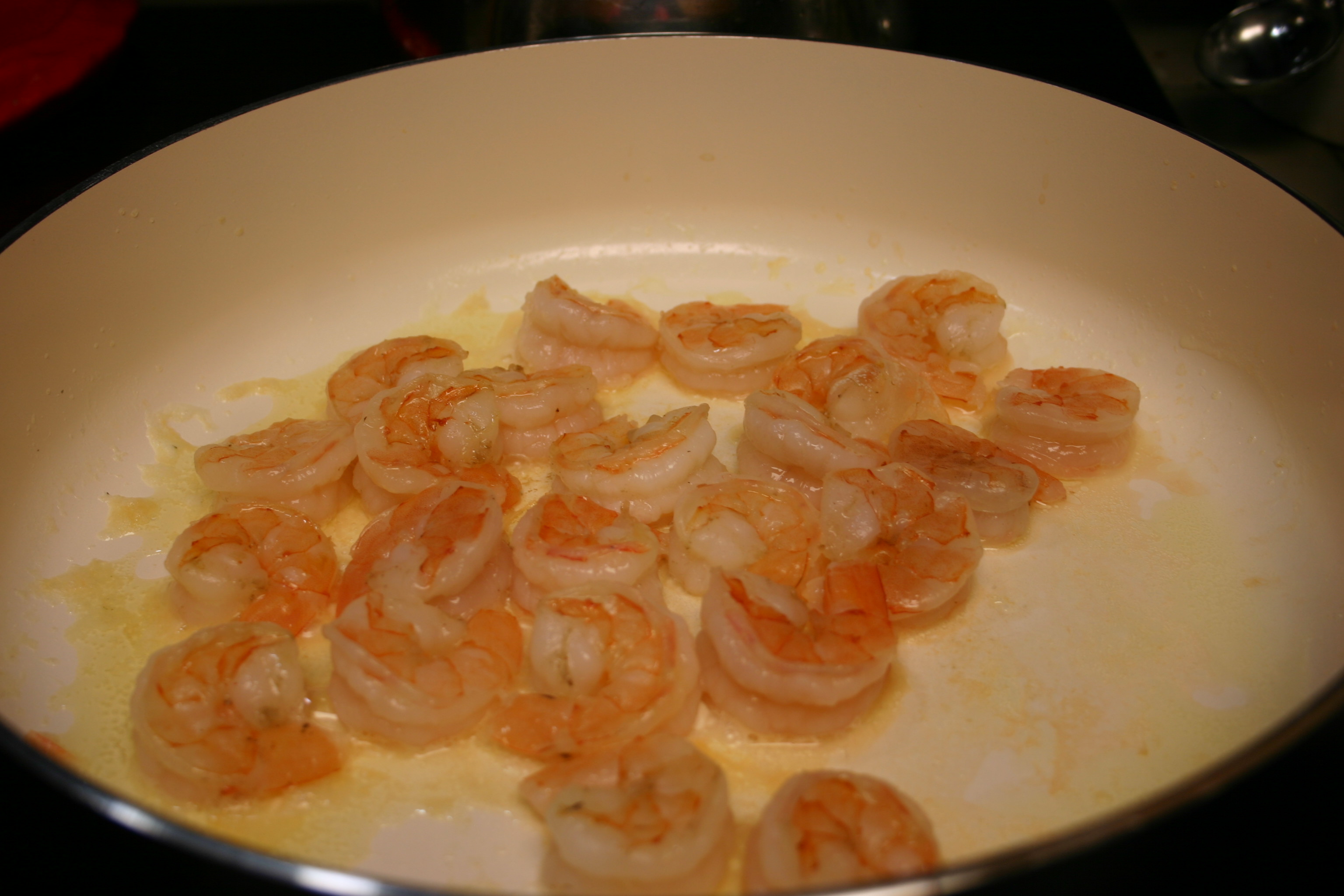 While the pasta cooks, place a skillet over medium heat. Melt a tablespoon of butter in the skillet, swirl to coat the bottom of the pan. Sauté shrimp in the butter until pink, about 2 or 3 minutes per side. Remove shrimp, wrap in foil to keep warm and set aside.
