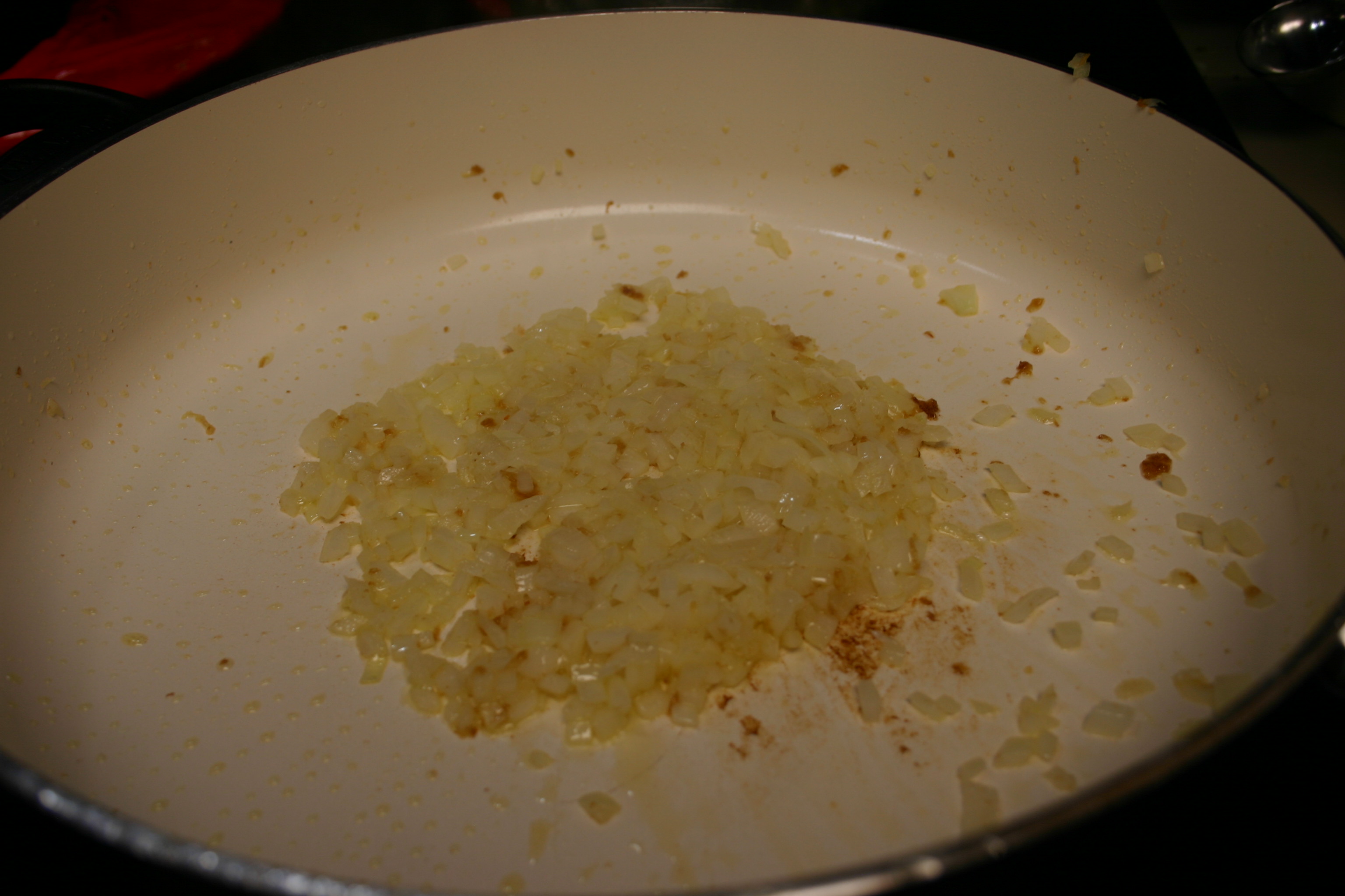Heat olive oil in the now empty skillet. Sauté onions until tender and translucent, about 3 minutes. Stir in the garlic, remaining 7 tablespoons of butter, sauté until garlic is soft and fragrant, about a minute longer.