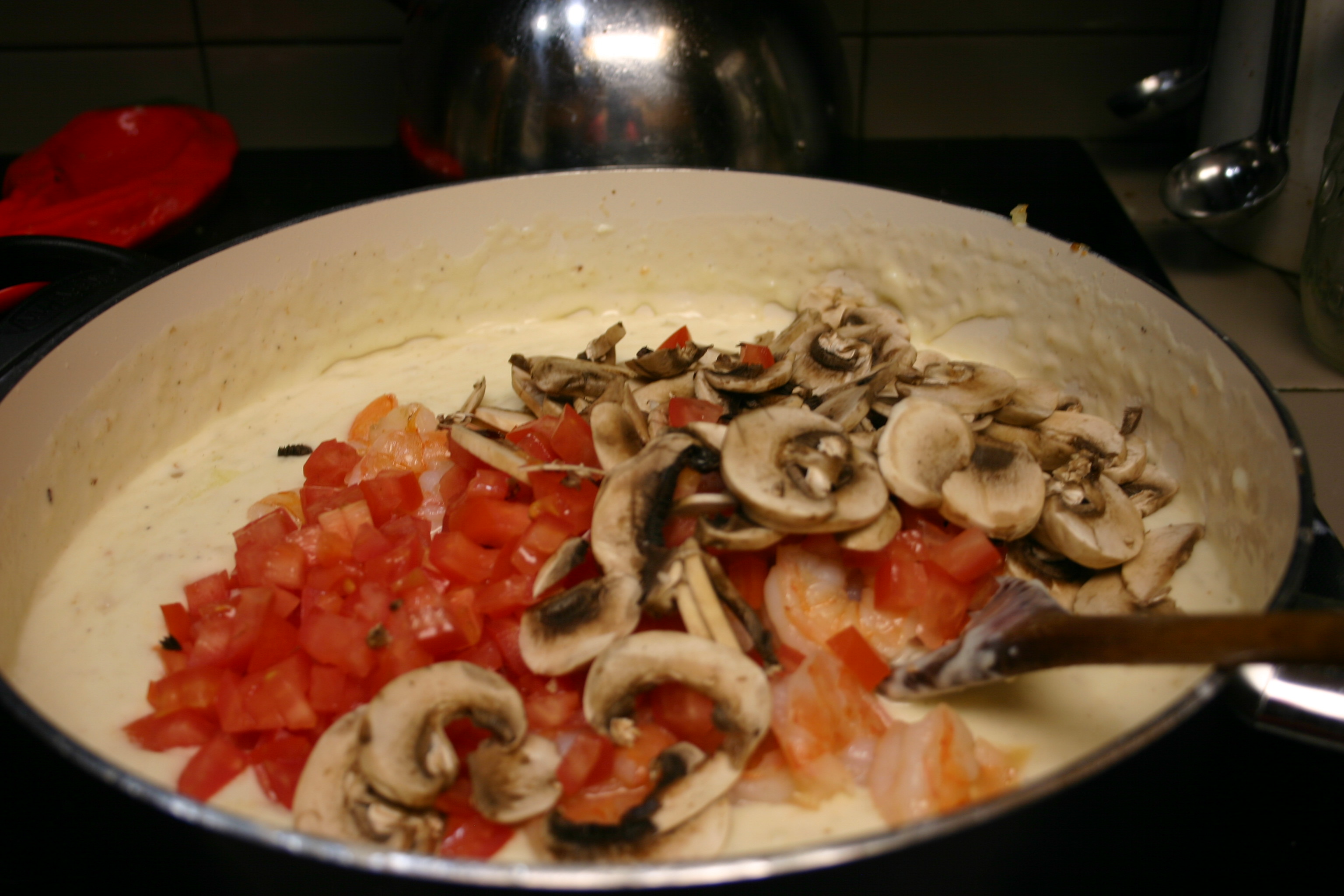 Whisk flour into the milk, add to the onion mixture. Season with salt and pepper, simmer for 4 minutes, stirring constantly. Add cheese, stir until melted. Stir in pesto. Add shrimp, mushrooms and tomatoes; cook for about 4 minutes, or until heated through. If sauce appears too thick, thin with a little pasta water until creamy.