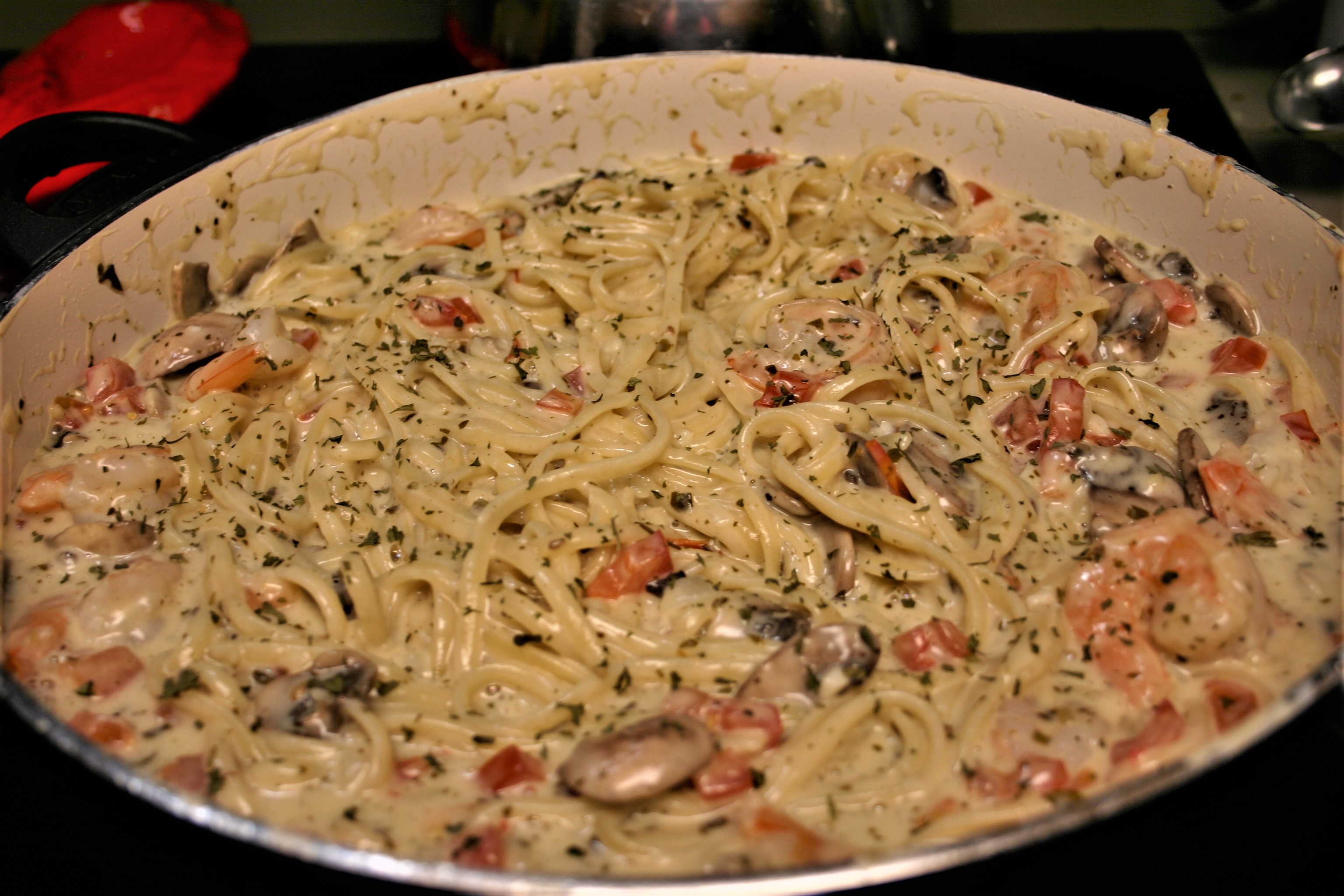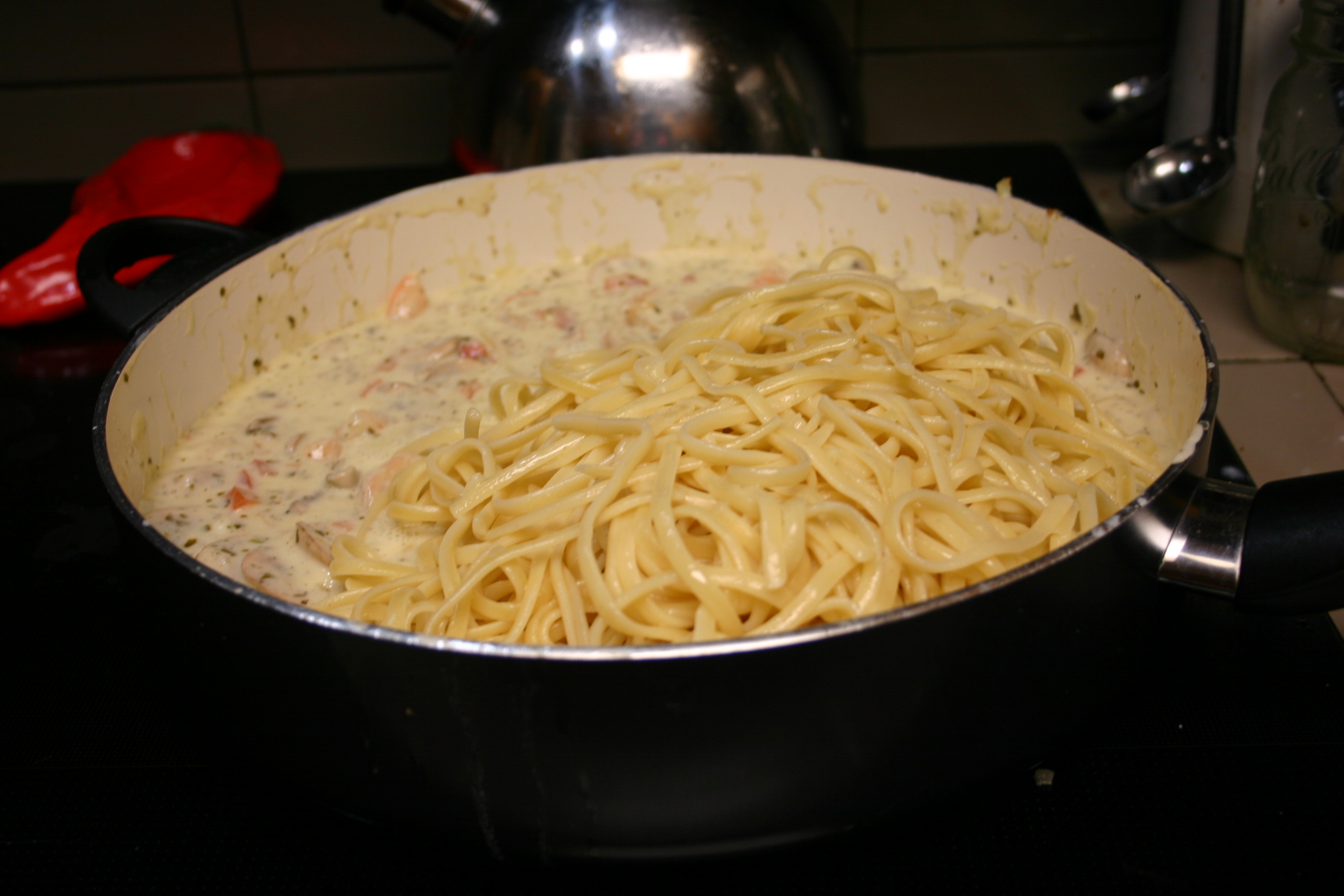 Add pasta to the pan. Pull pasta through sauce to coat well. Serve into warm plates and enjoy. Perfect with a light salad and warm bread.