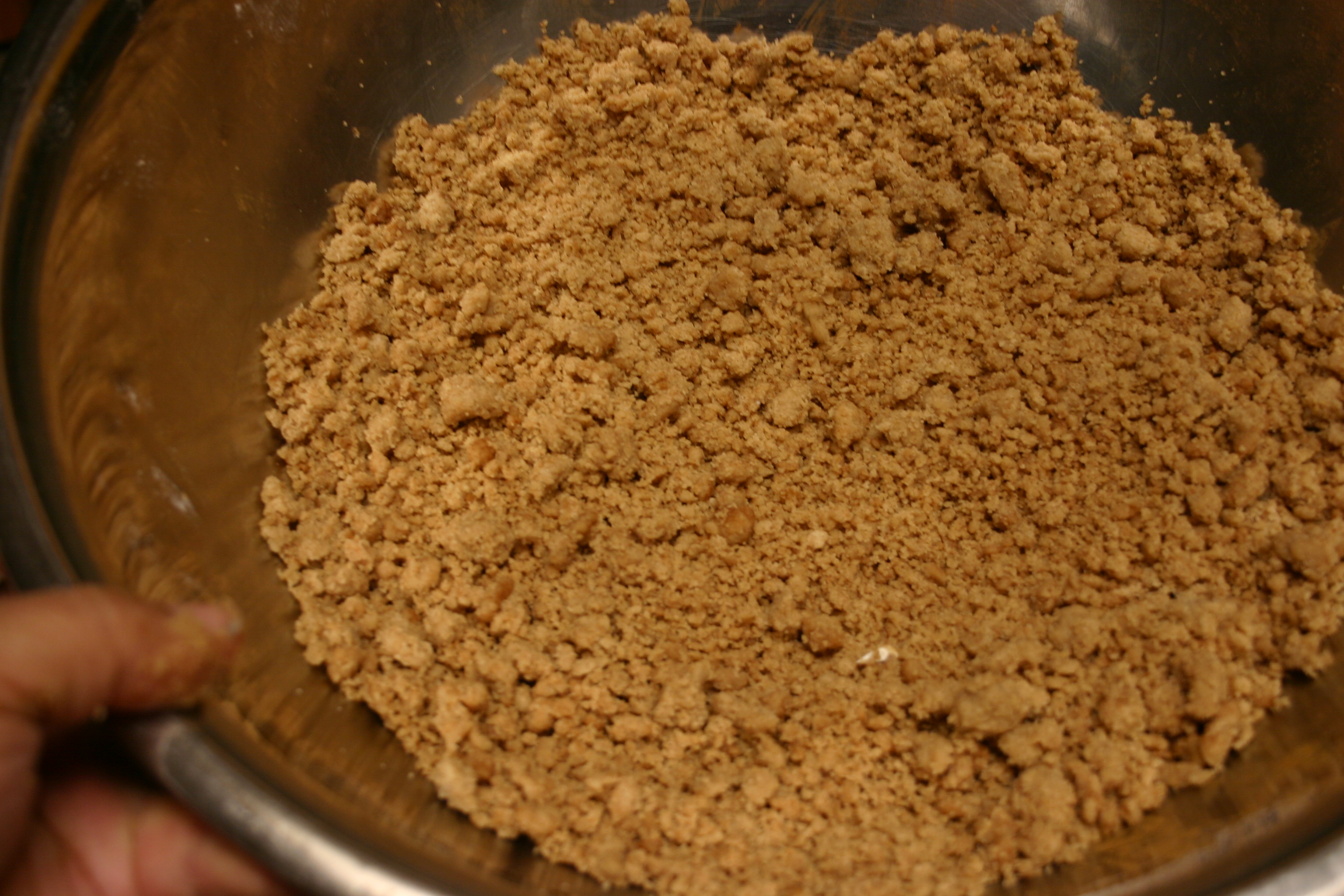 Dice the butter into small pieces, place in the bowl of a food processor fitted with a blade. Add brown sugar, cinnamon, vanilla and 2 cups of flour. Pulse until medium crumbs form. Transfer to a large bowl. Sprinkle with remaining 1/2-cup flour, work into mixture with fingertips. Set aside.