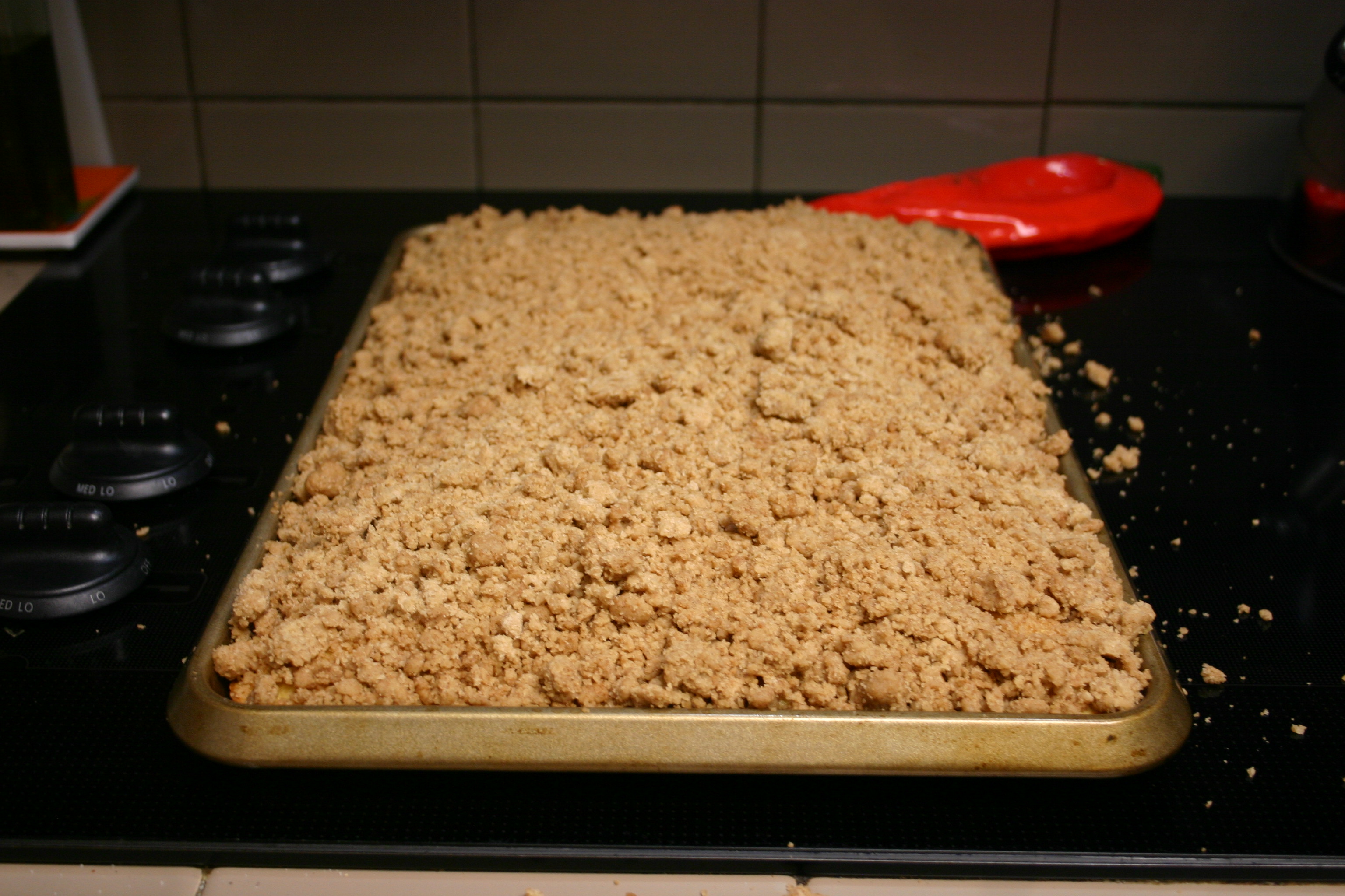 Remove the cake from the oven, press about 3/4 of the crump topping over the top of the almost-baked coffee cake. Reserve remaining topping.