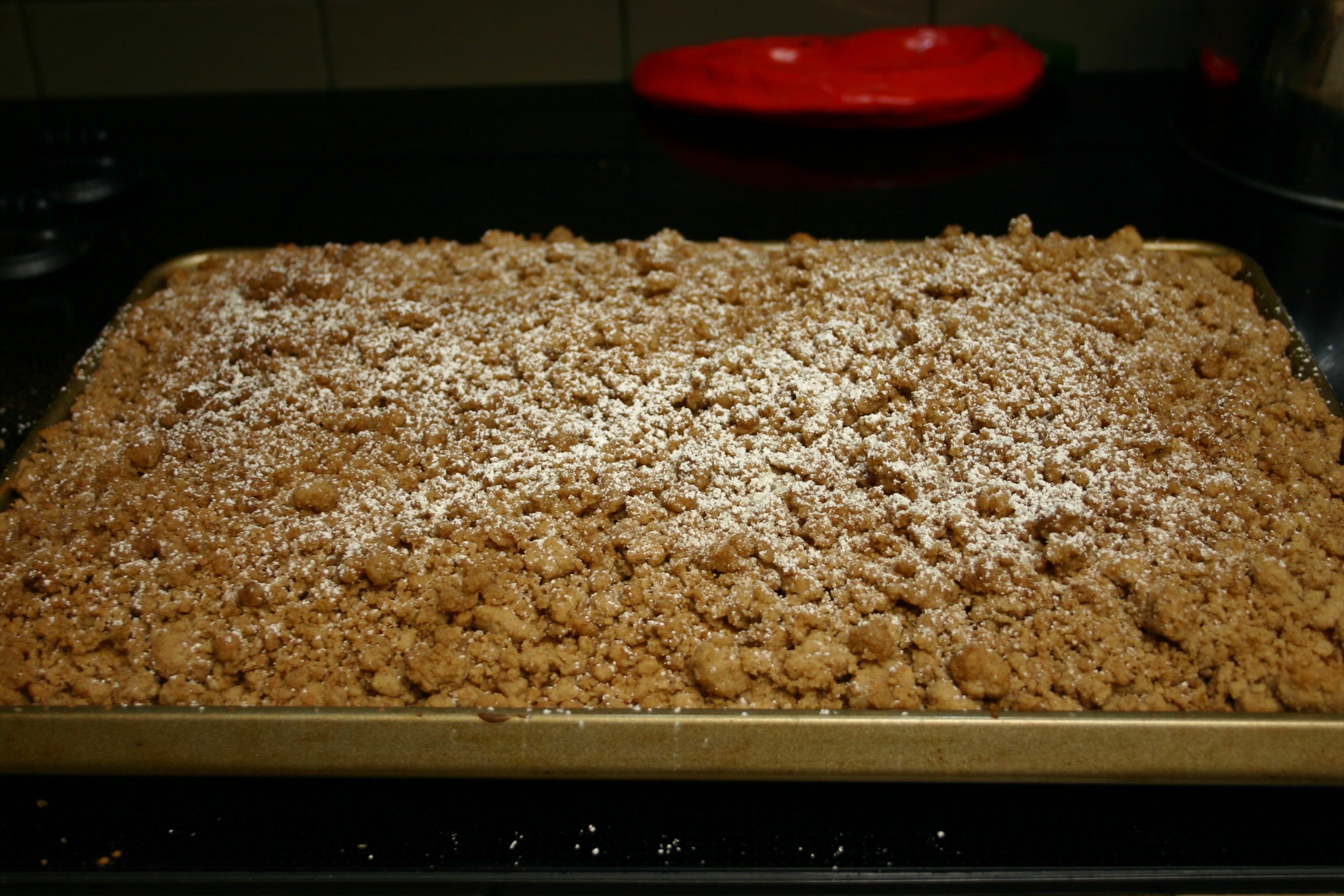Remove coffee cake from the oven, sprinkle with remaining crumb topping, dust with powdered sugar. Let cake cool for about 10 minutes. Slice into squares, serve warm.