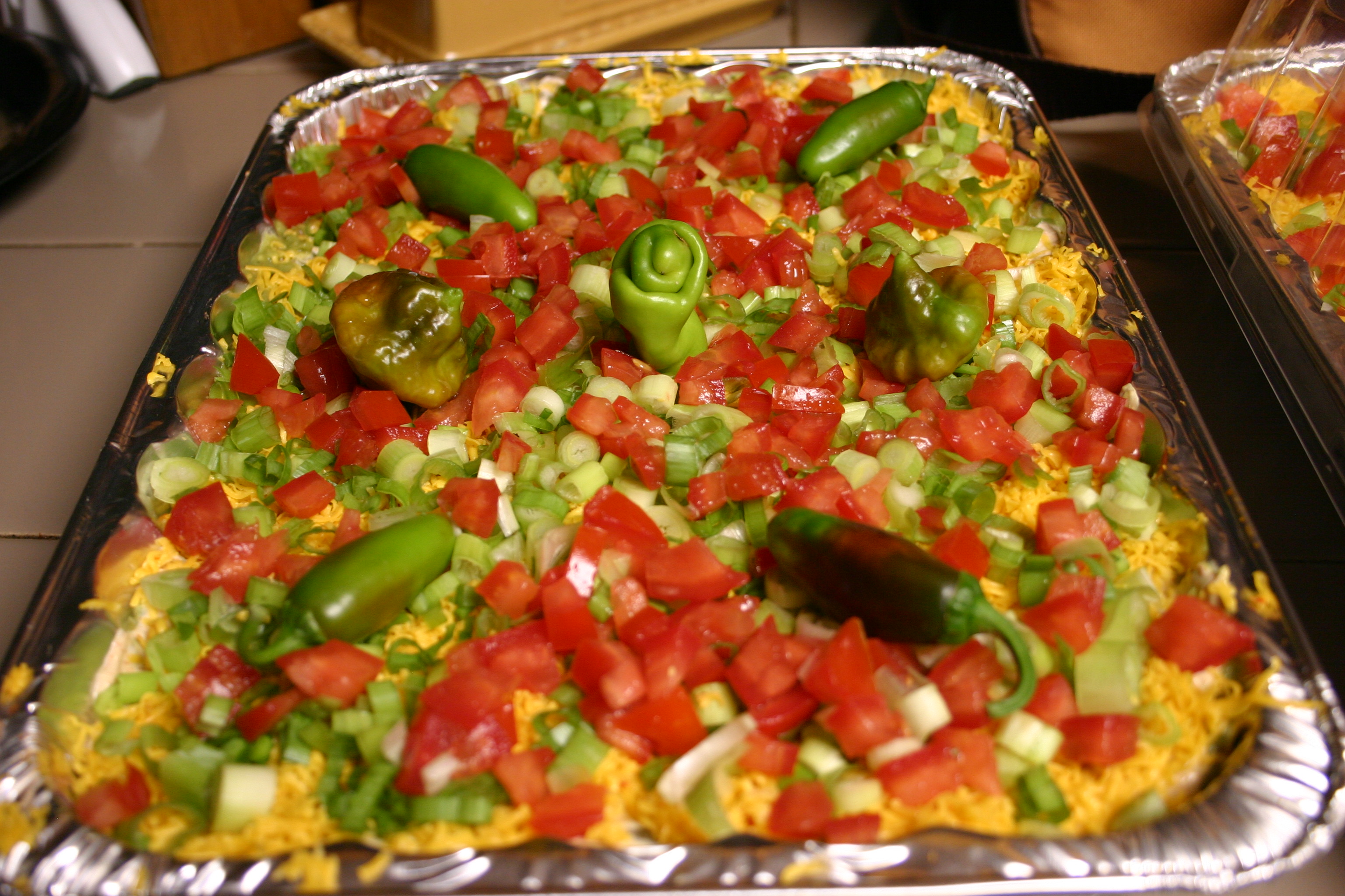 To finish, sprinkle green onions and diced tomatoes over the top of the layered dip. Adorn with desired fresh peppers to indicate level of heat. Refrigerate until ready to serve. Great with Tortilla Strips.