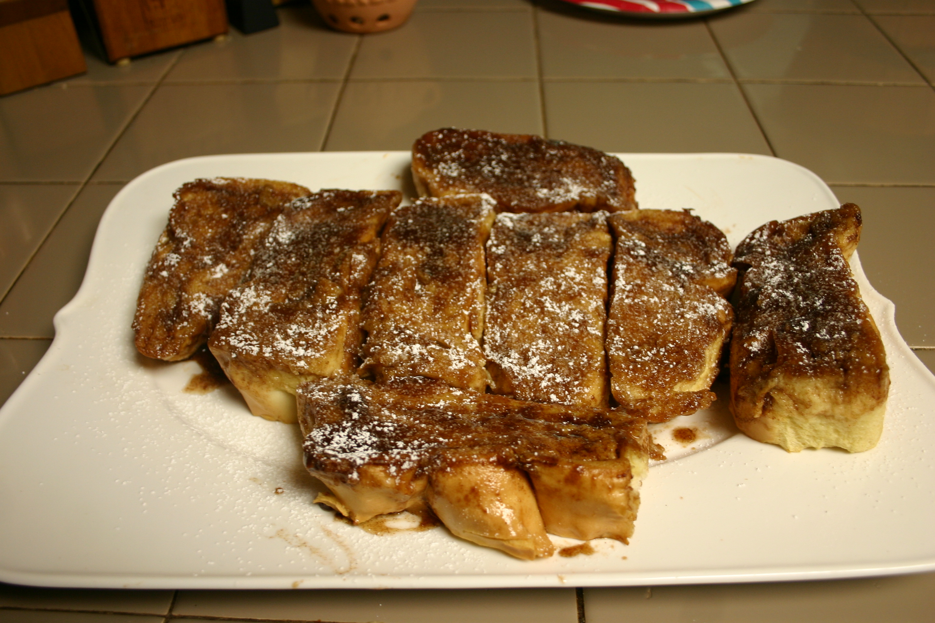 Bake in the heated oven; uncovered; for about 20 to 25 minutes. Remove from oven, loosen bread from the pan. With a spatula, lift Caramelized French Toast, place on a serving platter, brown sugar side sup. Drizzle any remaining brown sugar in the casserole dish over the toast. Dust lightly with powdered sugar, serve and enjoy. While butter on the toast is fine, there is no need to add syrup. This toast is sinfully rich and delicious.