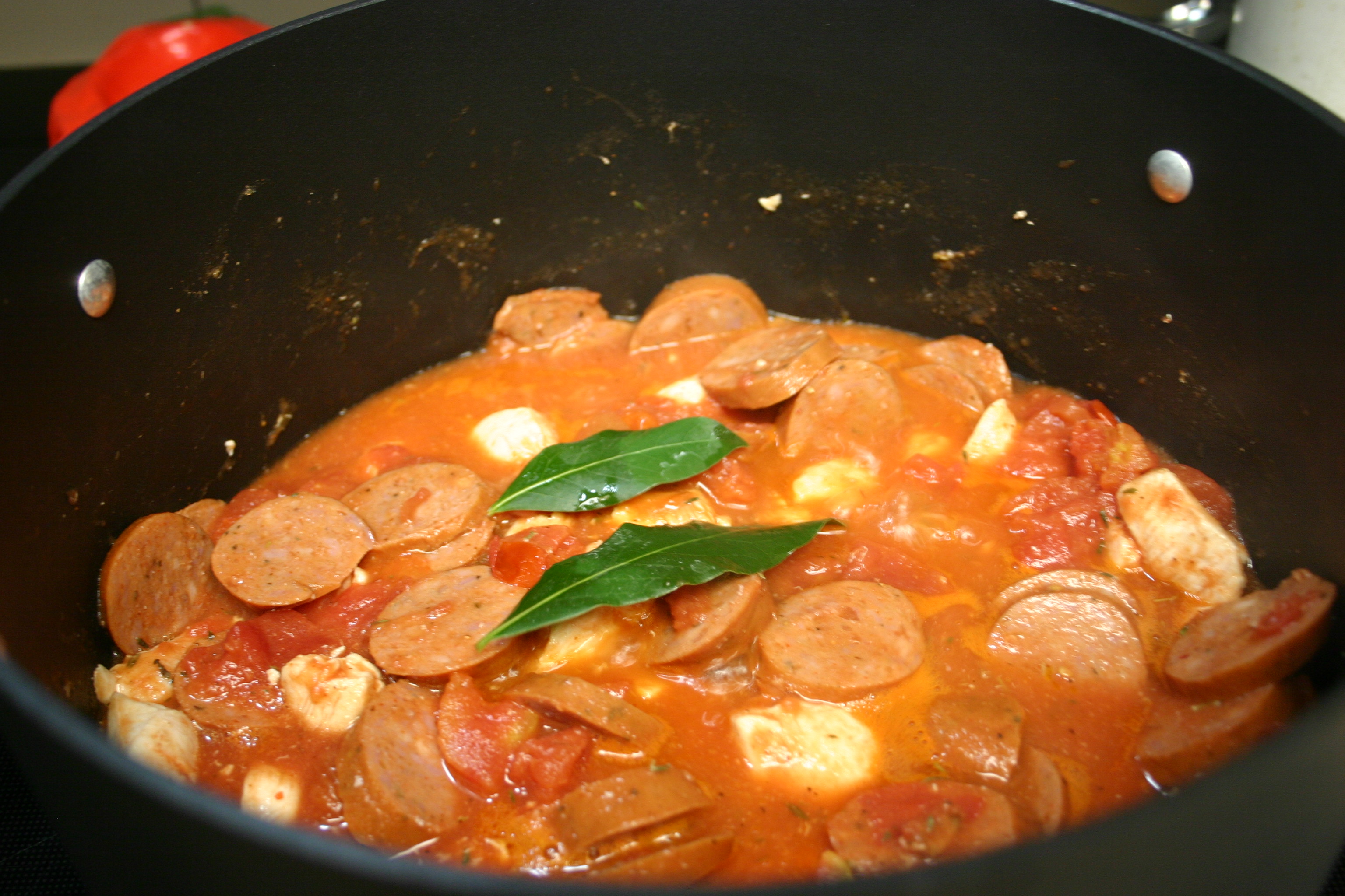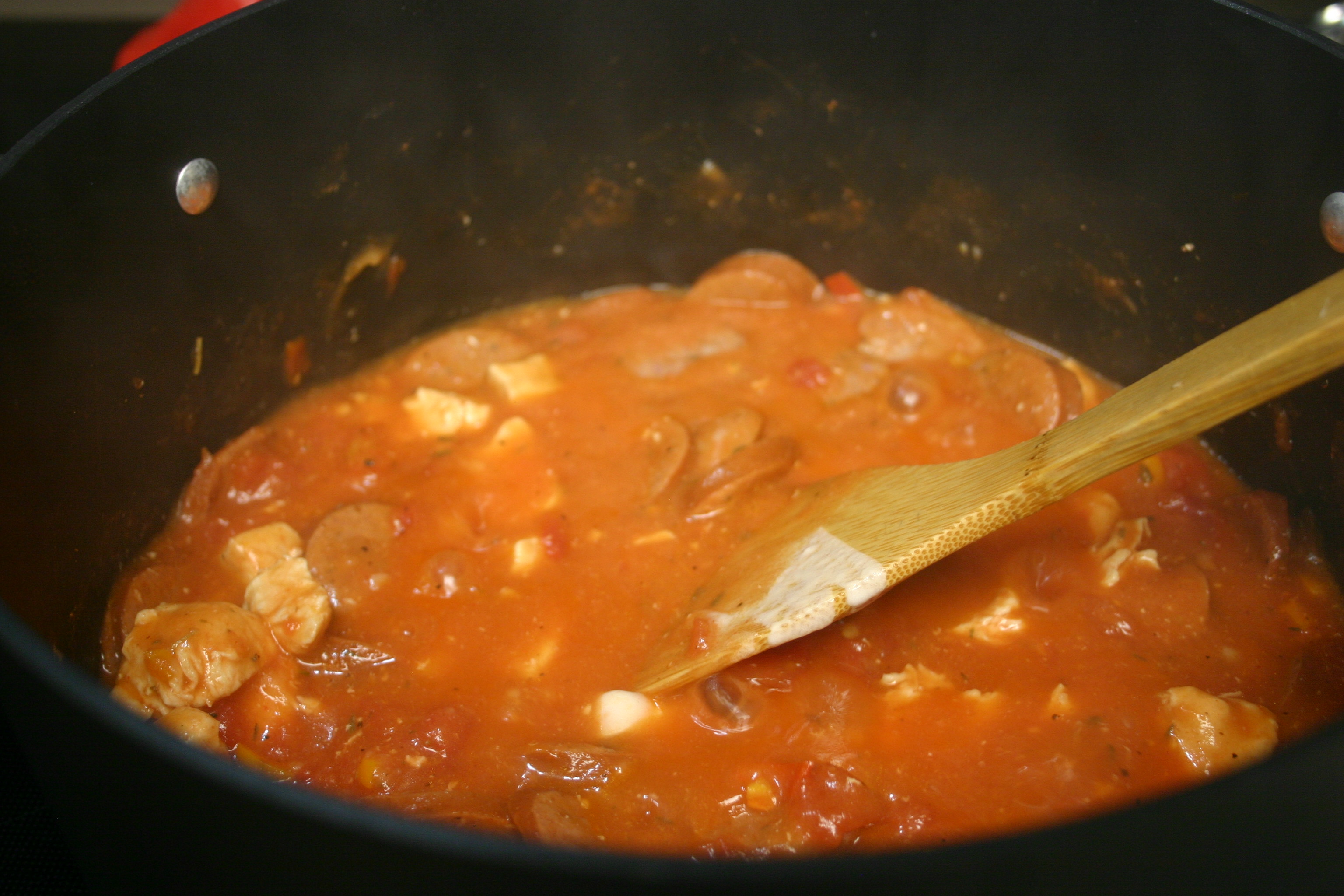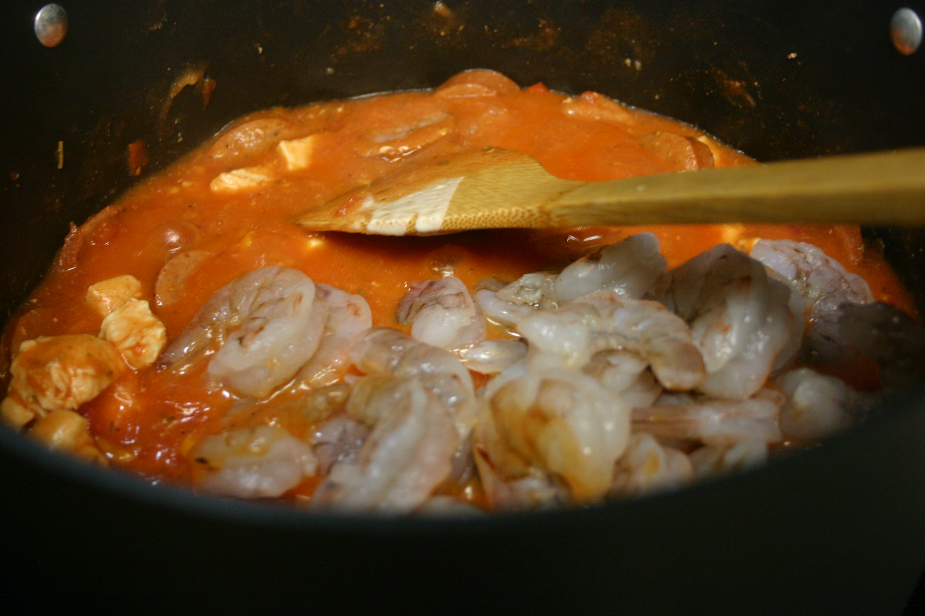 Cut sausage into 1/2-inch thick cuts on the bias, set aside. Cut chicken into 1/2-inch cubes, set aside. Peel and devein shrimp, remove tails. Keep shrimp chilled until ready to use.