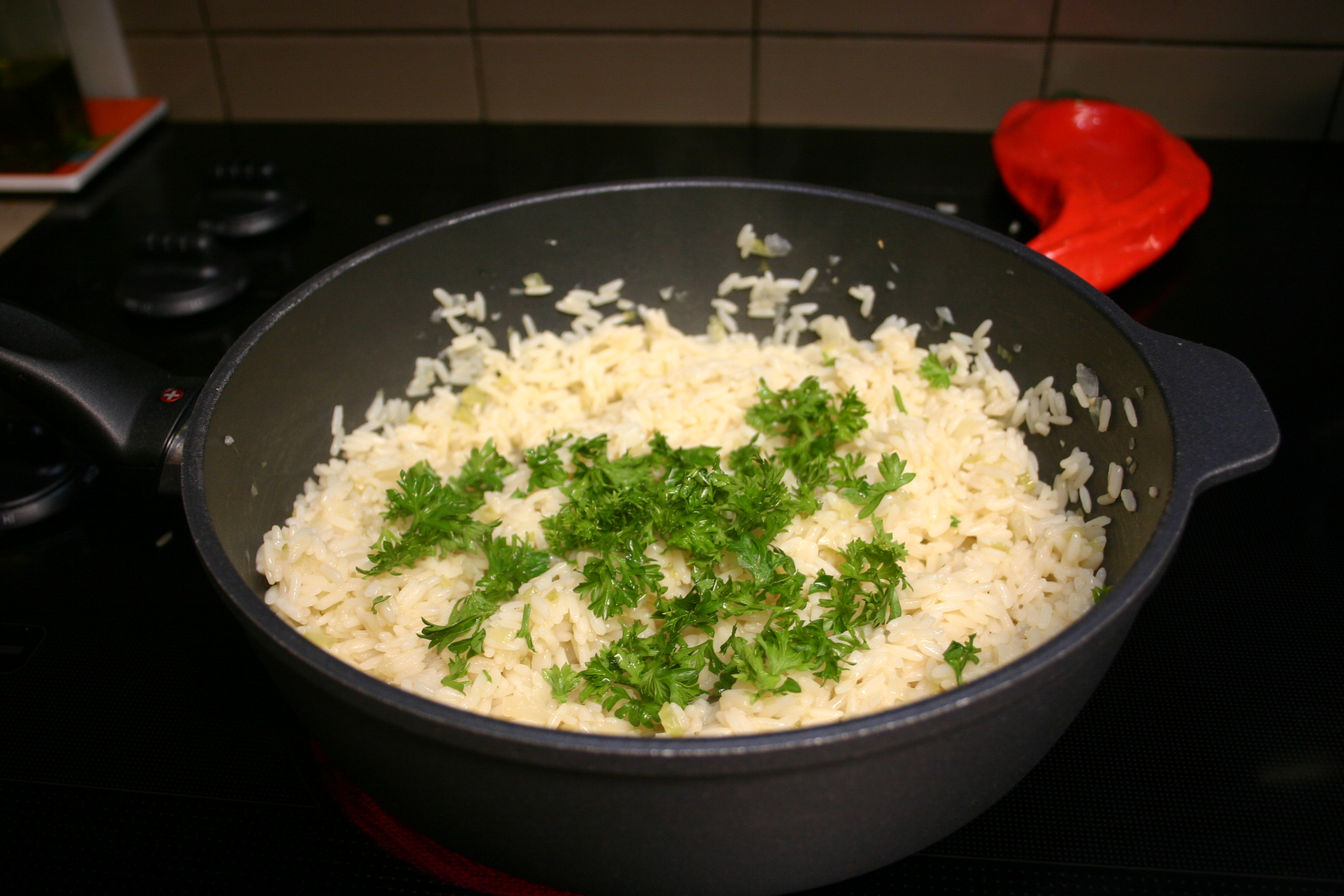 Remove rice from heat, let stand, covered, for 5 minutes. Mince parsley, stir into the rice. Serve rice in a bowl ladled with gumbo. Enjoy.