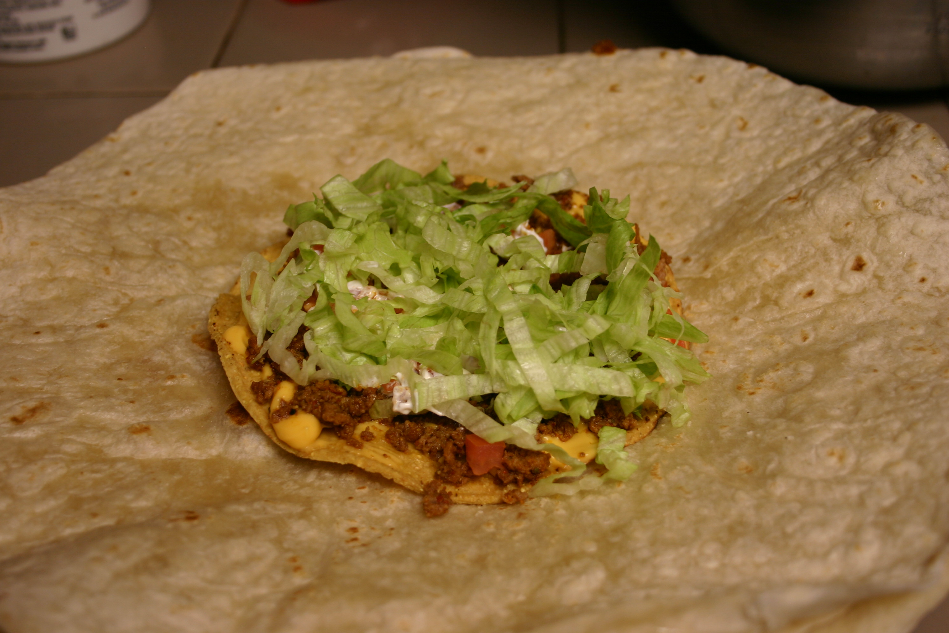 Lay one large flour tortilla on your work surface. Spread Nacho Cheese Sauce on one side of a Tostada shell and place it in the middle of the flour tortilla, cheese side up. Spoon meat over the cheese. Sprinkle with some chopped tomatoes. Dollop a little sour cream on top of the tomatoes. Finish with the shredded lettuce.