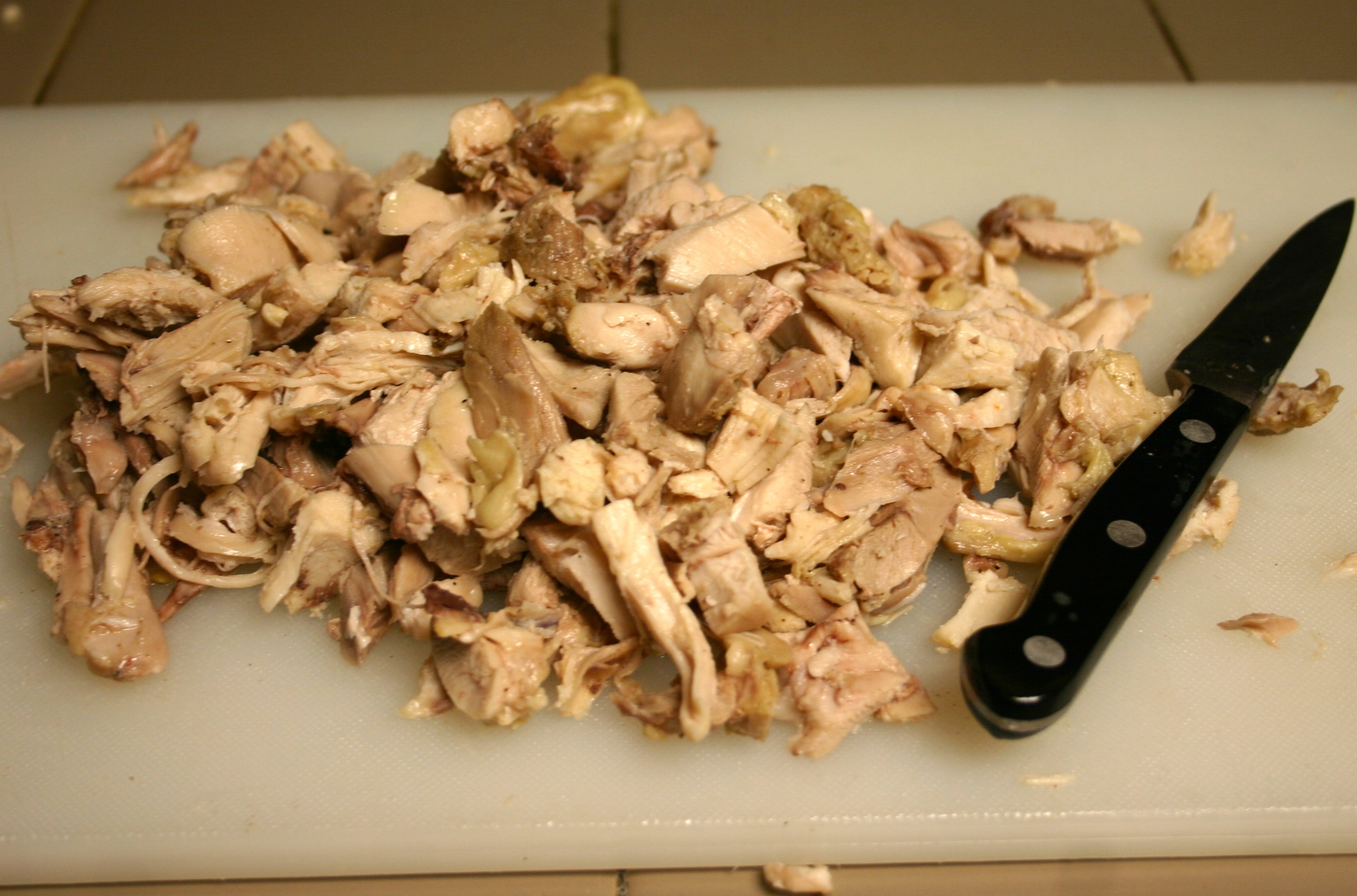Once the chicken is cool enough to handle, remove skin and bones, discard. Shred the meat.