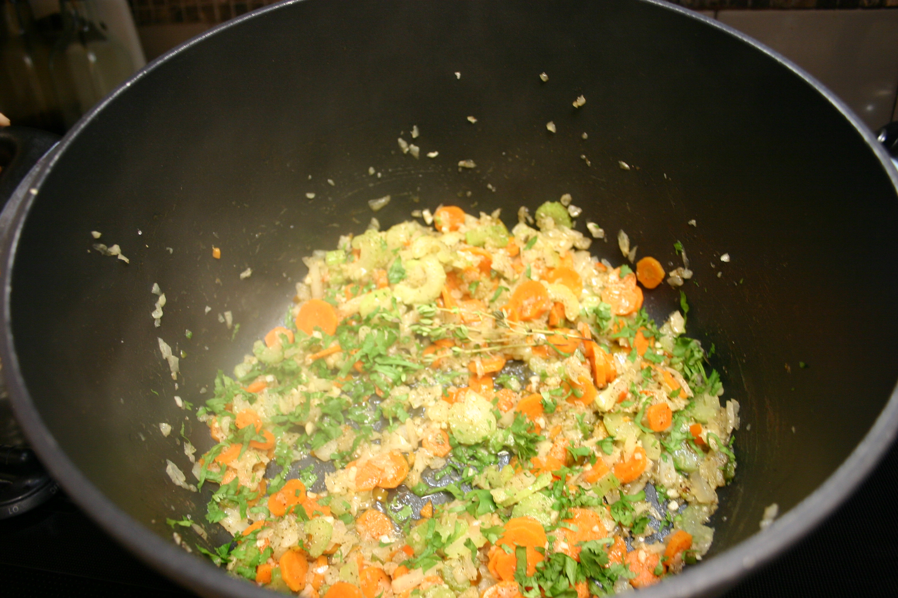 Peel and dice onion, set aside. Peel and slice carrots, set aside. Trim ends from celery, slice and set aside. Peel and mince garlic, set aside. Mince cilantro. Stem peppers, split open and dice. Set aside.
