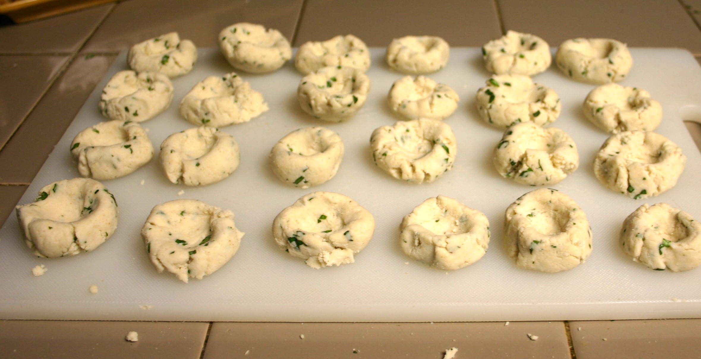 Break off pieces of dough, about a tablespoon each, and roll into a ball. With thumb, create a crater in the center of each dumplings ball for even cooking. Cover with a damp towel, let rest until ready to cook.