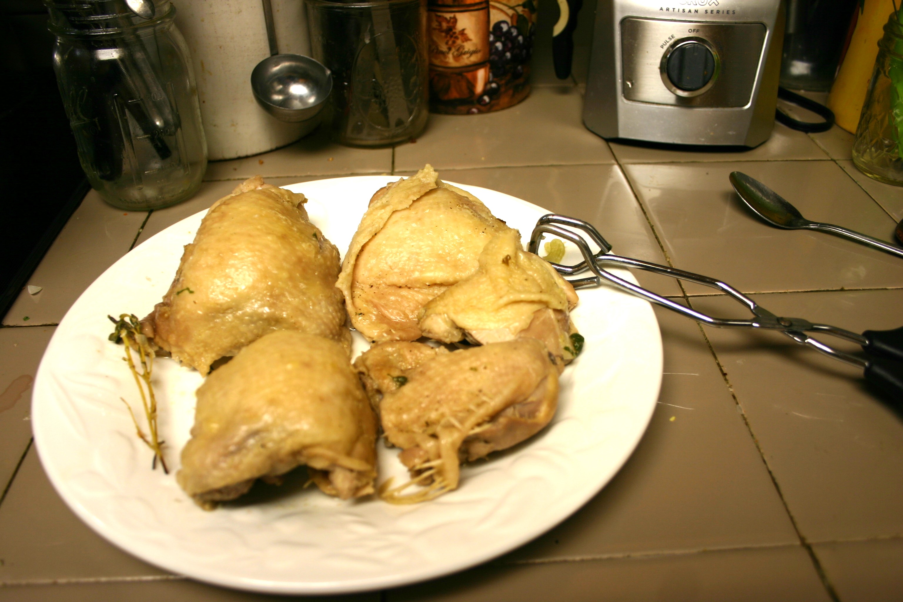 Once the soup has been simmering for 30 minutes and the chicken is tender, remove thighs and fish out the thyme sprigs. Set chicken aside to cool.