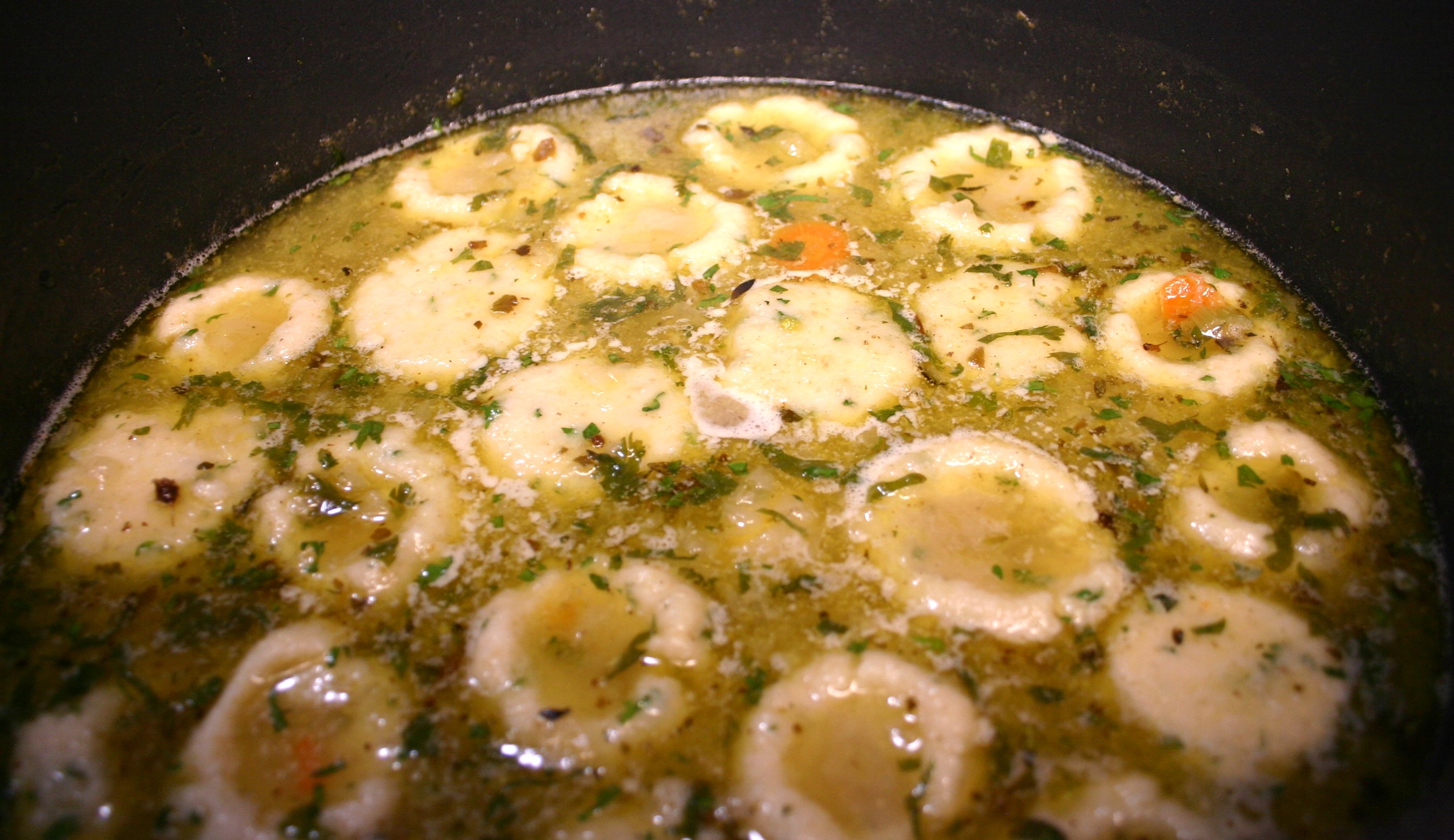 Lower heat under the soup to the lowest simmer possible. Add dumplings, making sure they are fully submerged in the broth. Cook gently for 20 minutes. The dumplings should puff up slightly but not change much in overall appearance.