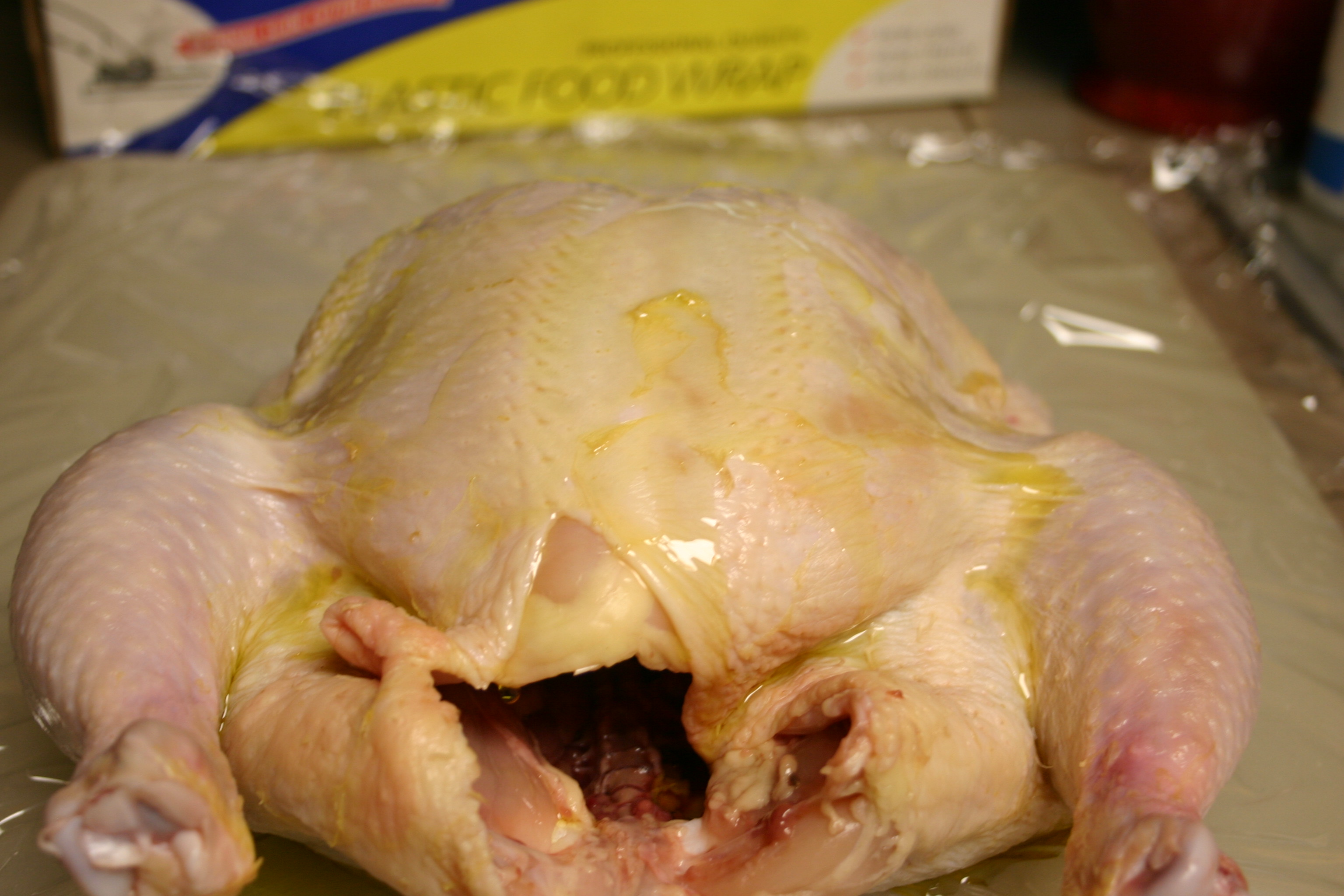 Pull any excess fat from the chicken. Remove and discard giblets, if any, from the cavity. Rinse chicken cavity, pat dry with paper towels. Place chicken on prepared board. Drizzle chicken with oil, gently rub into the skin. Set bird aside.
