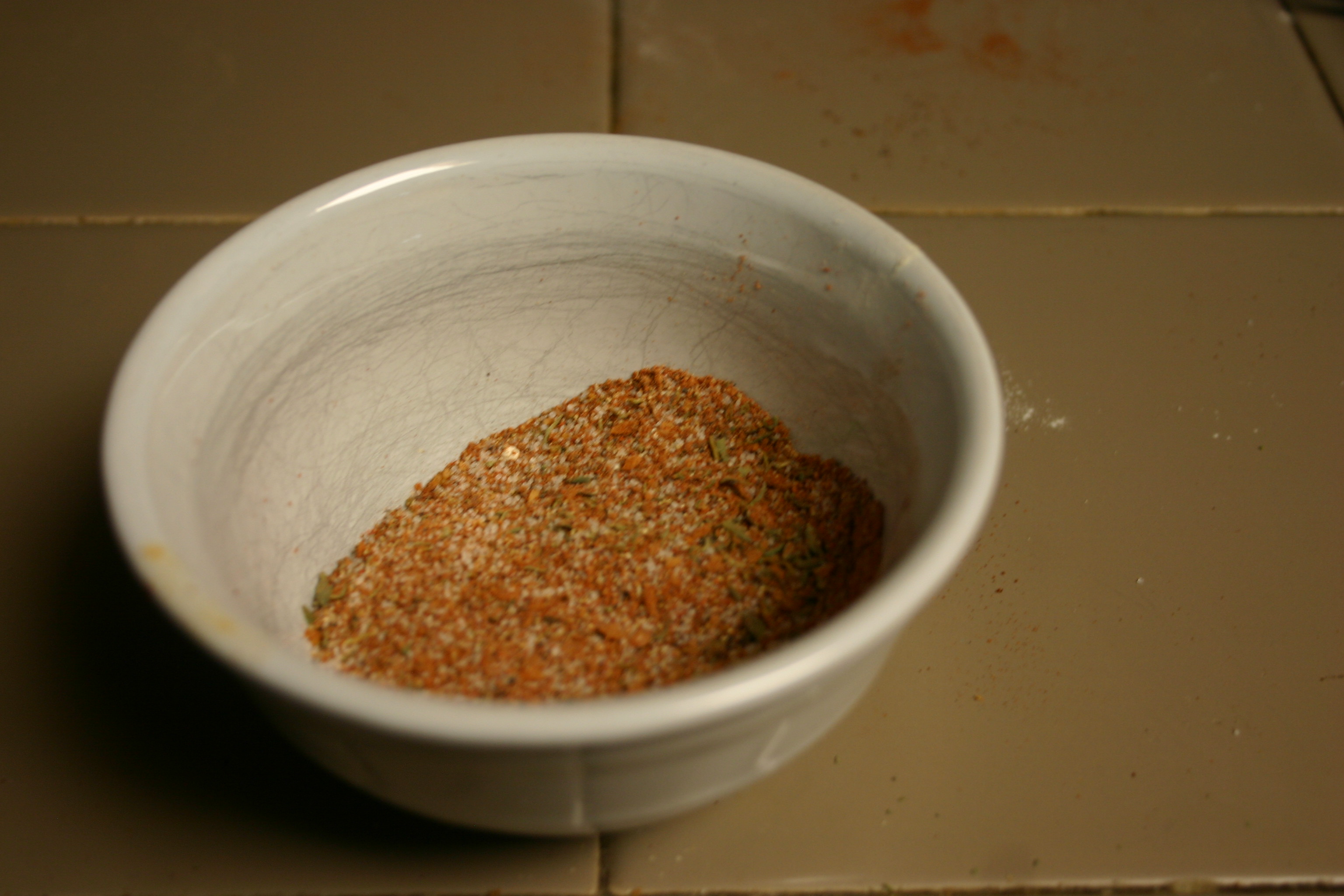 In a small bowl, mix together the salt, paprika, onion powder, thyme, black pepper, cayenne pepper and garlic powder plus 1-1/2 teaspoons of the Mesquite Seasoning. Set mixture aside.
