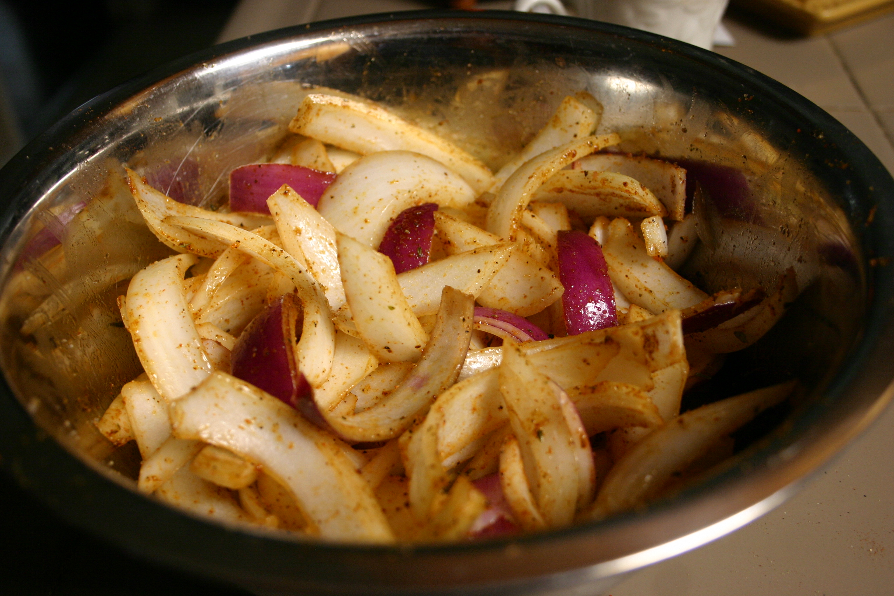 Peel onions, trim ends and cut onions from root to tip in long chunks. Place onions in a bowl. Drizzle with a little oil, sprinkle with a tablespoon of the seasoning mix. Toss to coat and set aside.