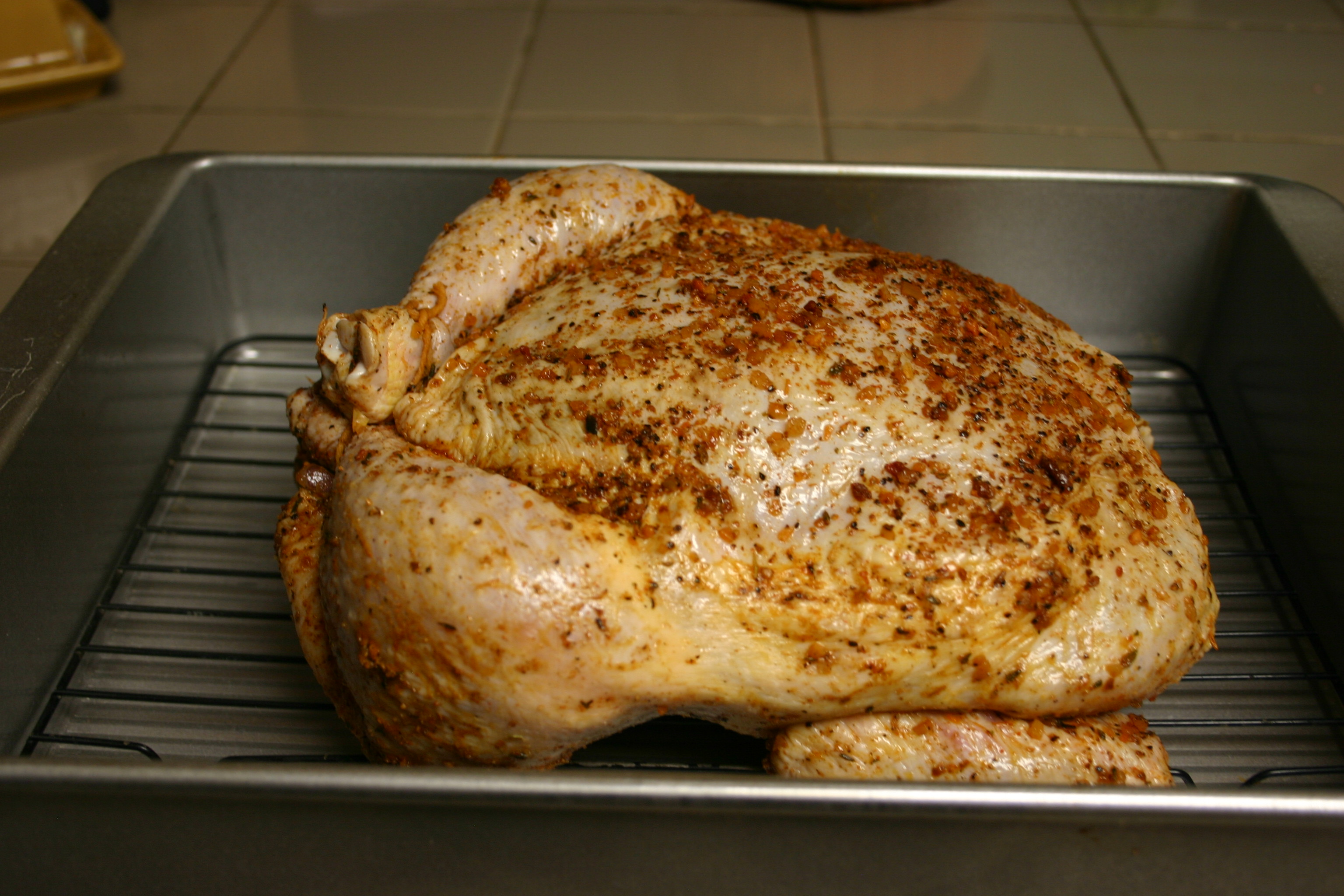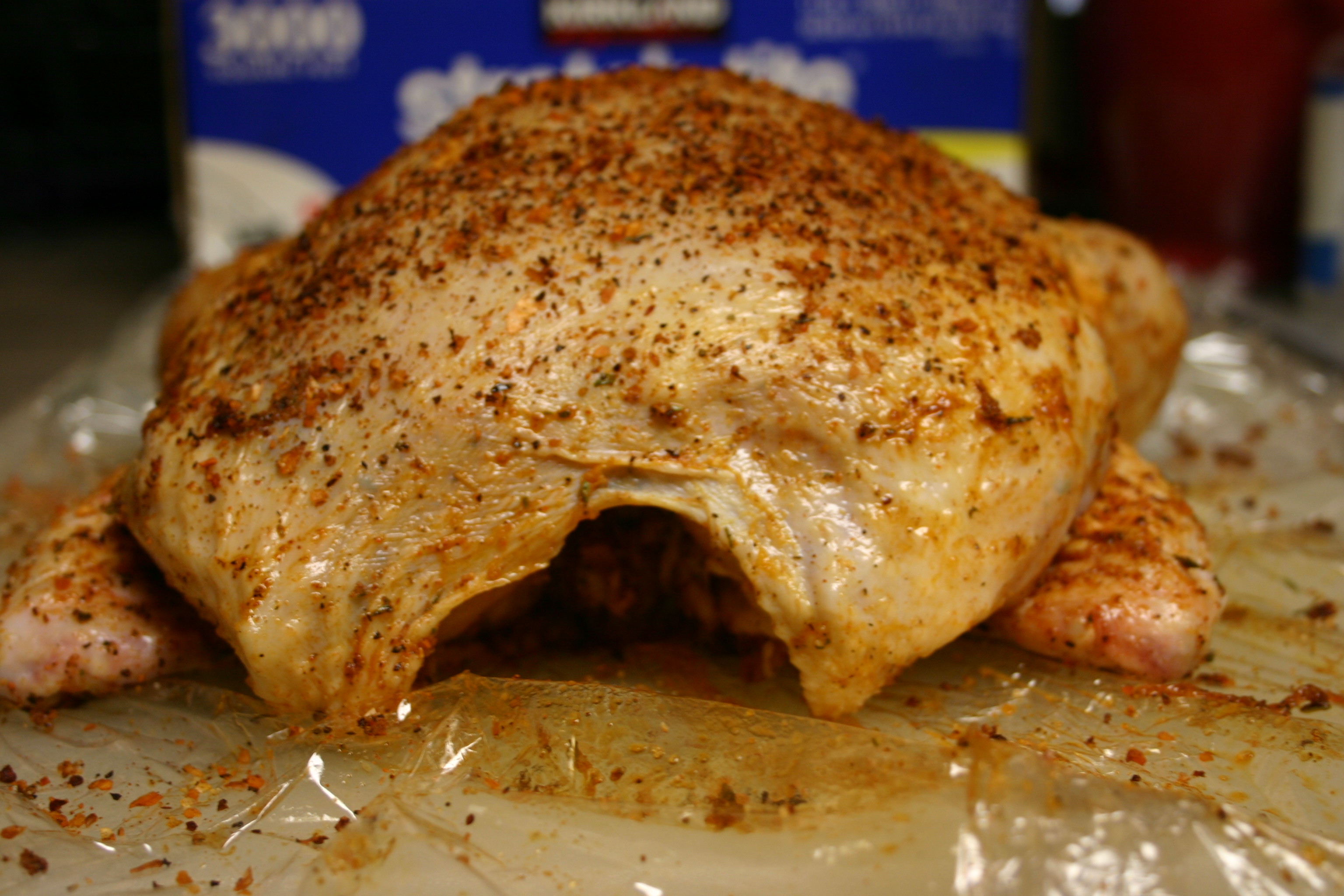 Sprinkle a little of the seasoning mix inside the neck and body cavities of the bird. Rub the outside of the chicken with remaining seasoning.