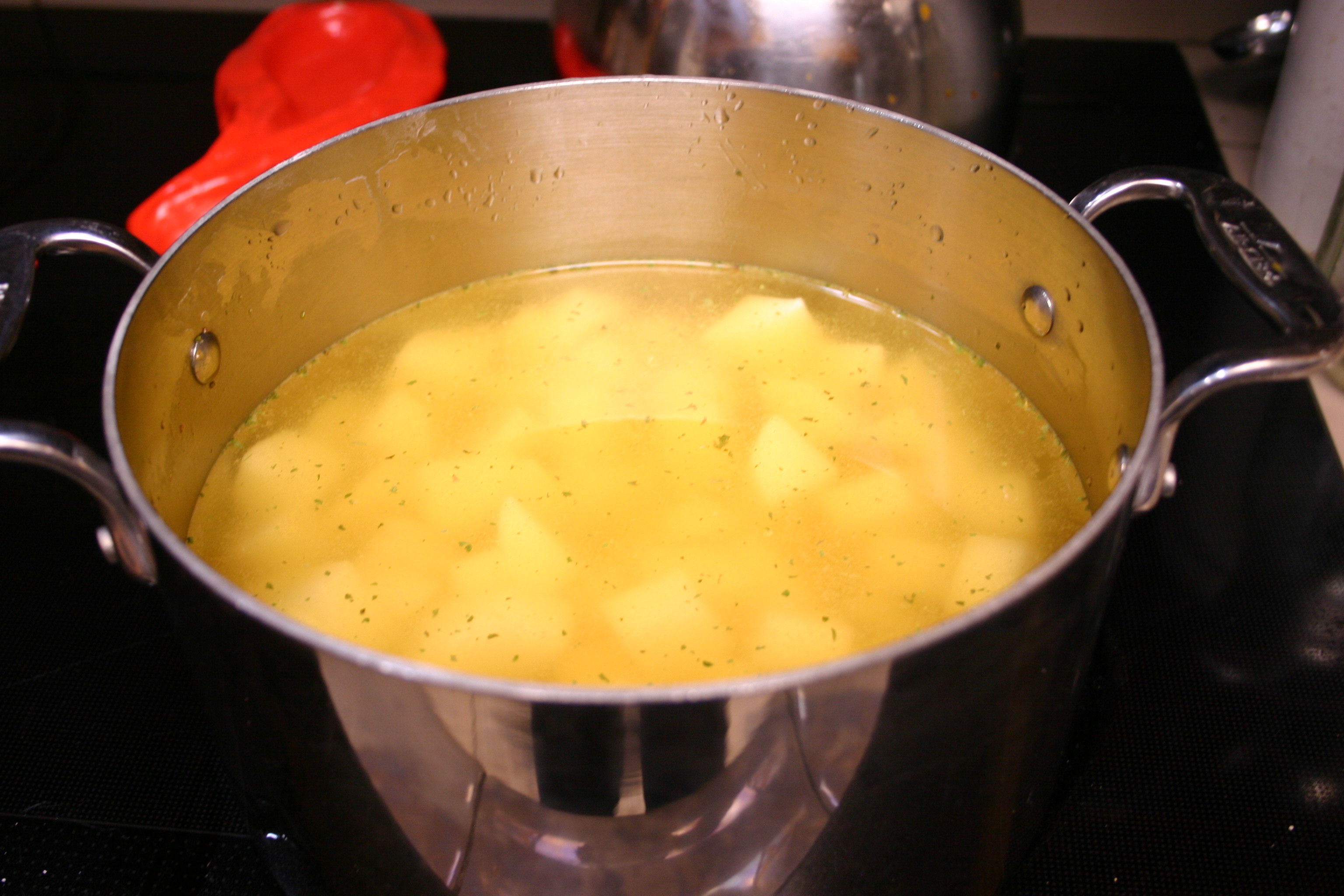 Peel and cut potatoes into 1-inch cubes. Place potatoes in a large pot with enough water to cover the potatoes by about an inch. Add bouillon to the water. Bring to a boil over high heat, reduce and slow boil until potatoes are tender, about 15 minutes. Drain potatoes well in a colander.