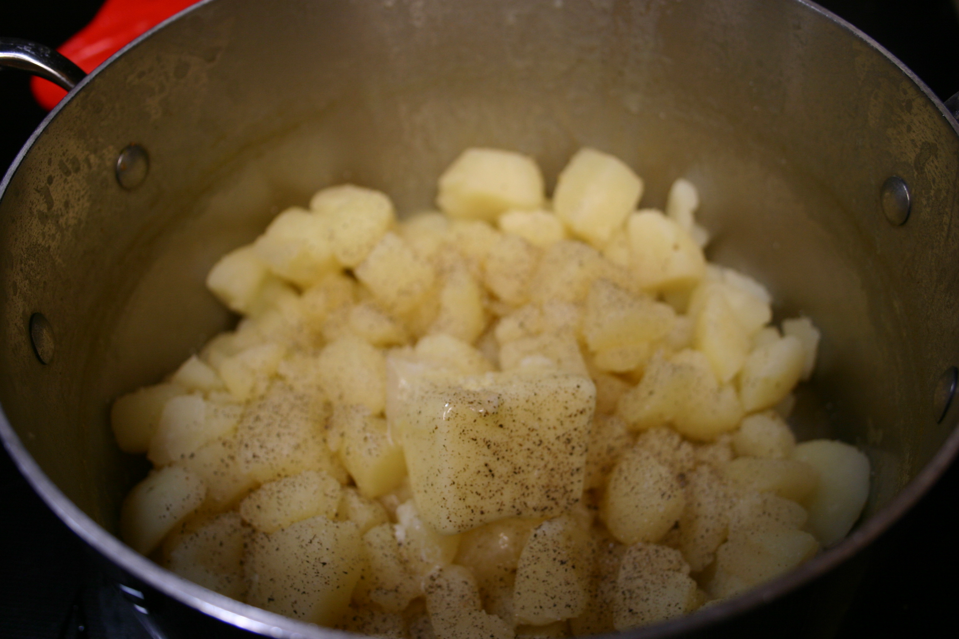 Return potatoes to the pot. Add butter, season with salt and pepper. Mash potatoes, adding a little milk until a nice thick mashed consistency is reached. Gently warm potatoes in the pot, stirring as needed.