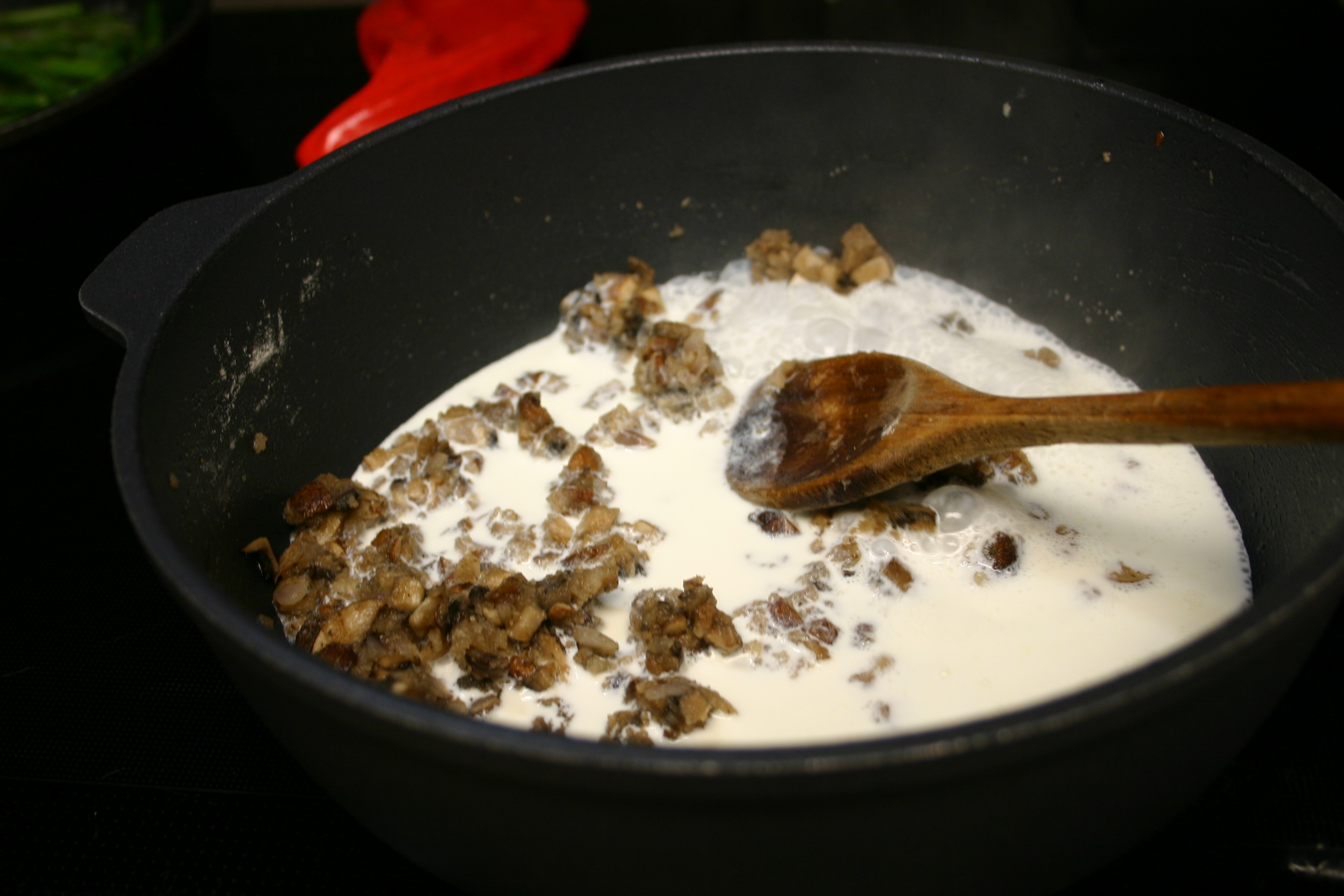 Meanwhile, chop remaining 5 mushrooms. Melt remaining butter in a saucepan. Sauté chopped mushrooms until soft. Add remaining minced shallots, continue to sauté until shallots are lightly browned. Sprinkle mushroom mixture with flour, cook for 3 minutes to remove any raw taste from the flour. Add half-and-half, bring to a bubbling boil. Mixture will be a thick paste at this point. Thin to a gravy consistence by whisking in the beef stock. Simmer until ready to serve.