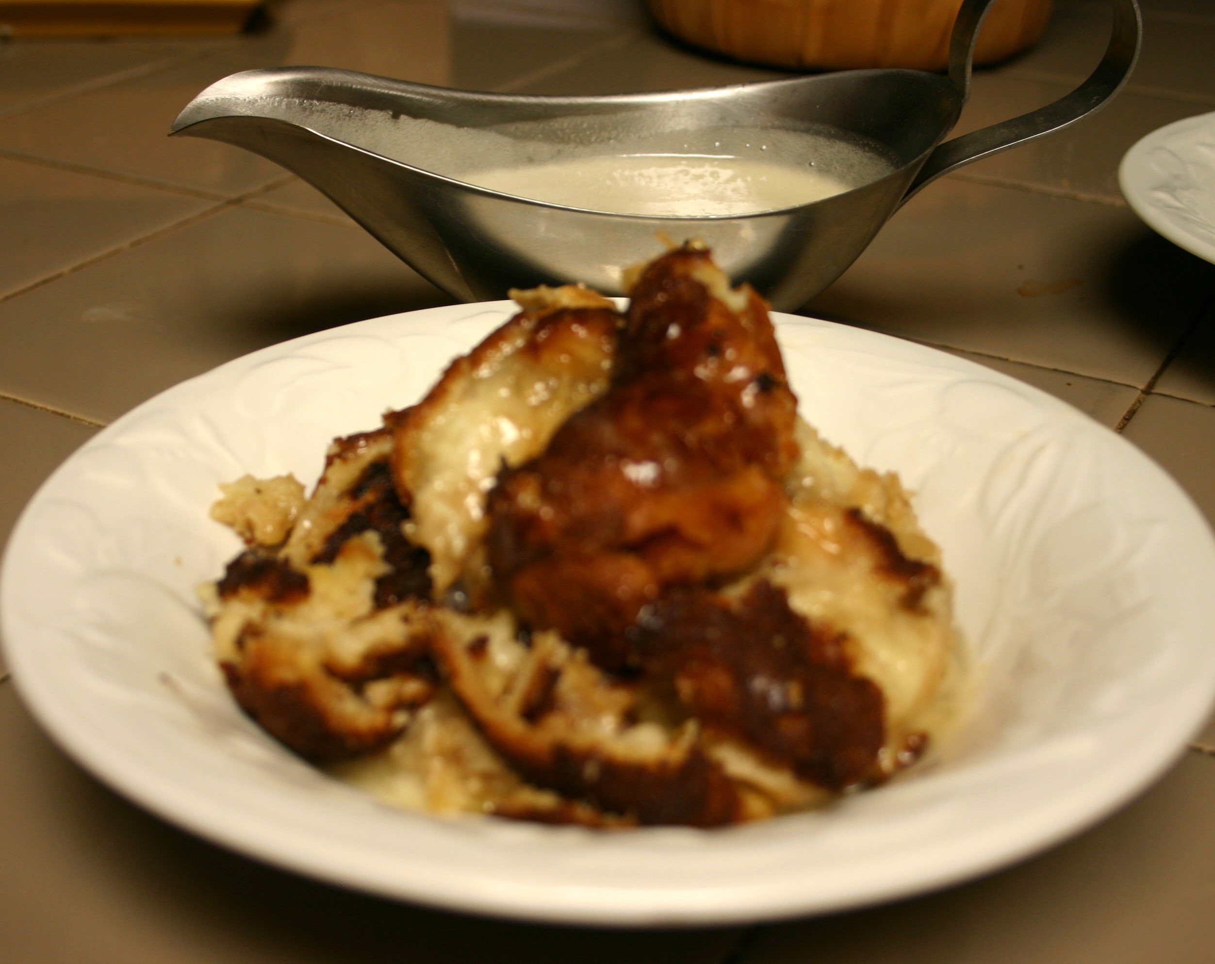 Pour bread pudding into the prepared dish, bake in the heated oven for about 45 minutes. Remove from oven; let cool for 15 minutes. Spoon pudding into bowls, set aside to cool further while the sauce is made.
