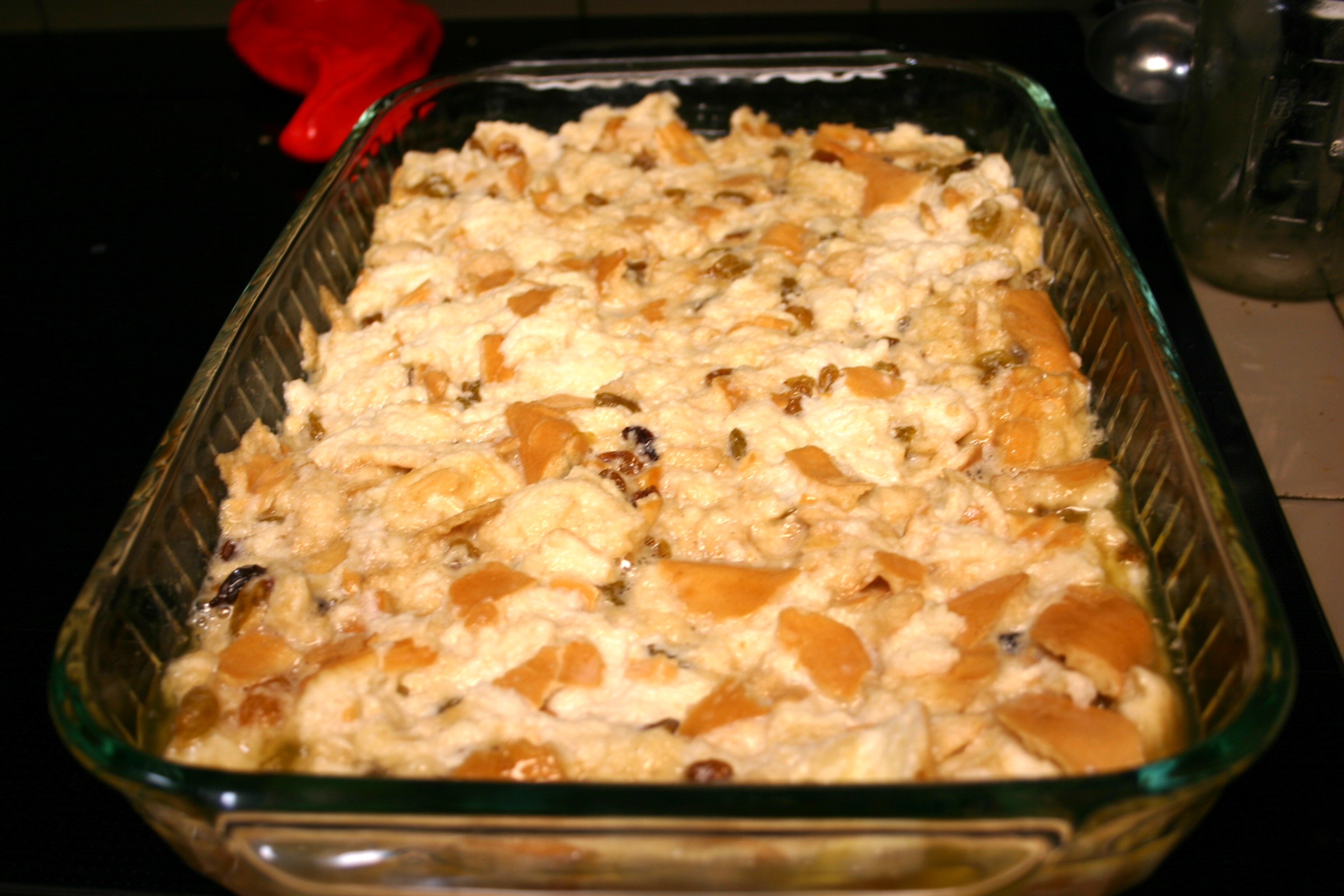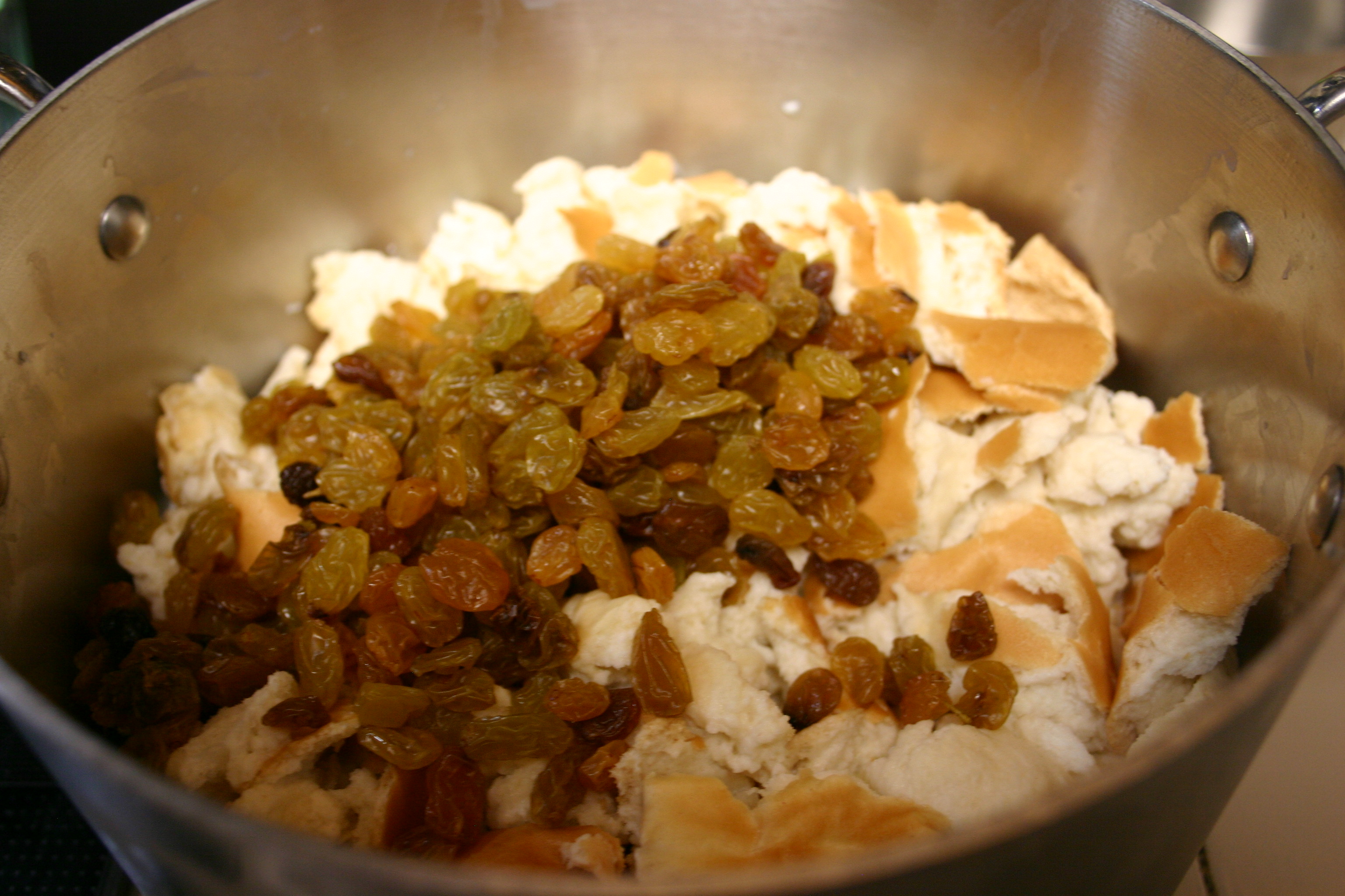 Remove bread from refrigerator. Stir in raisins, set aside. In a mixing bowl, beat eggs with sugar, cinnamon and vanilla. Pour over the bread mixture.