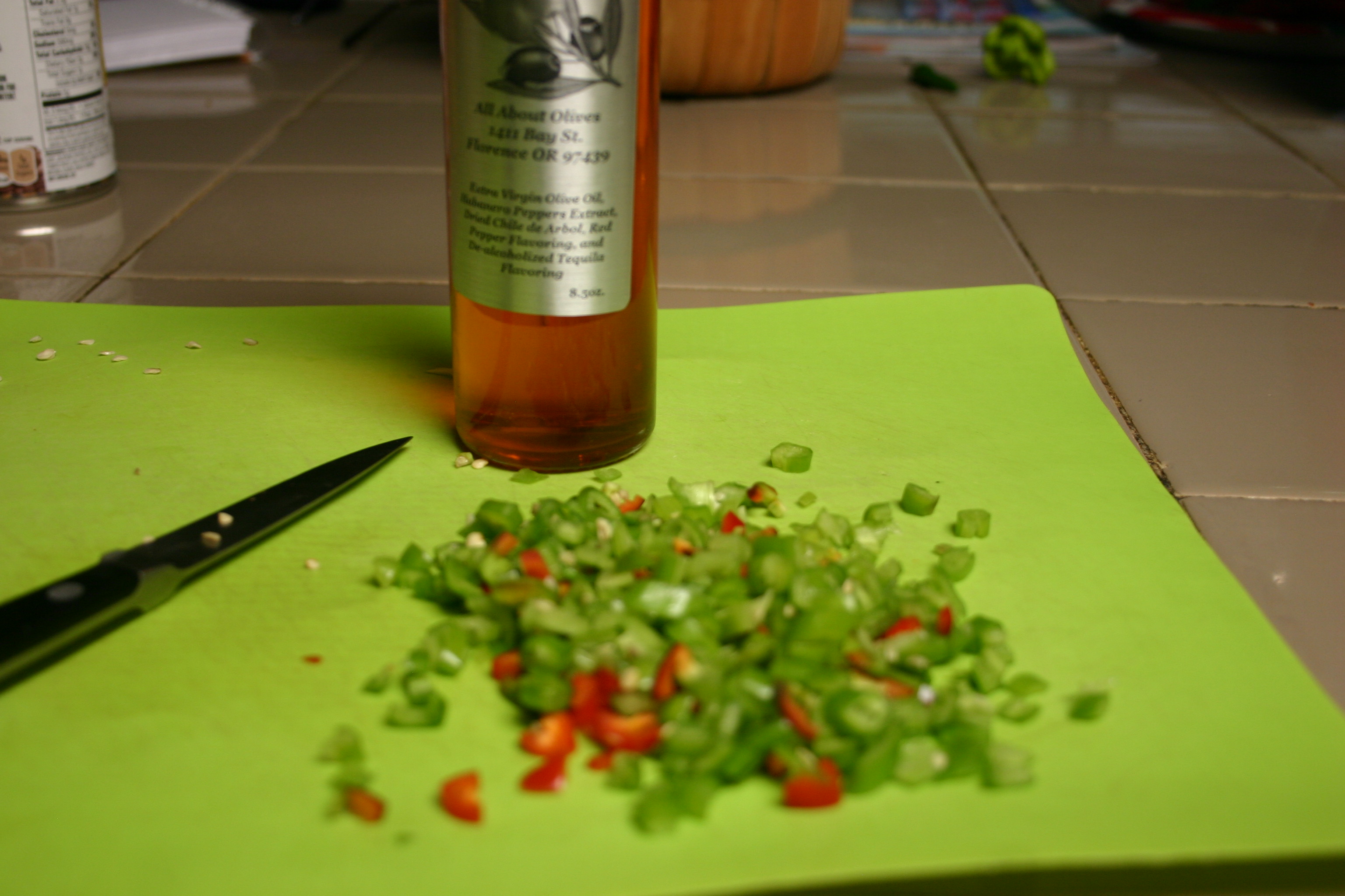 Stem peppers, split open, scrape out most of the seeds. Cut into strips, then dice. Warm oil in a cast iron skillet. Roast diced peppers, set aside.