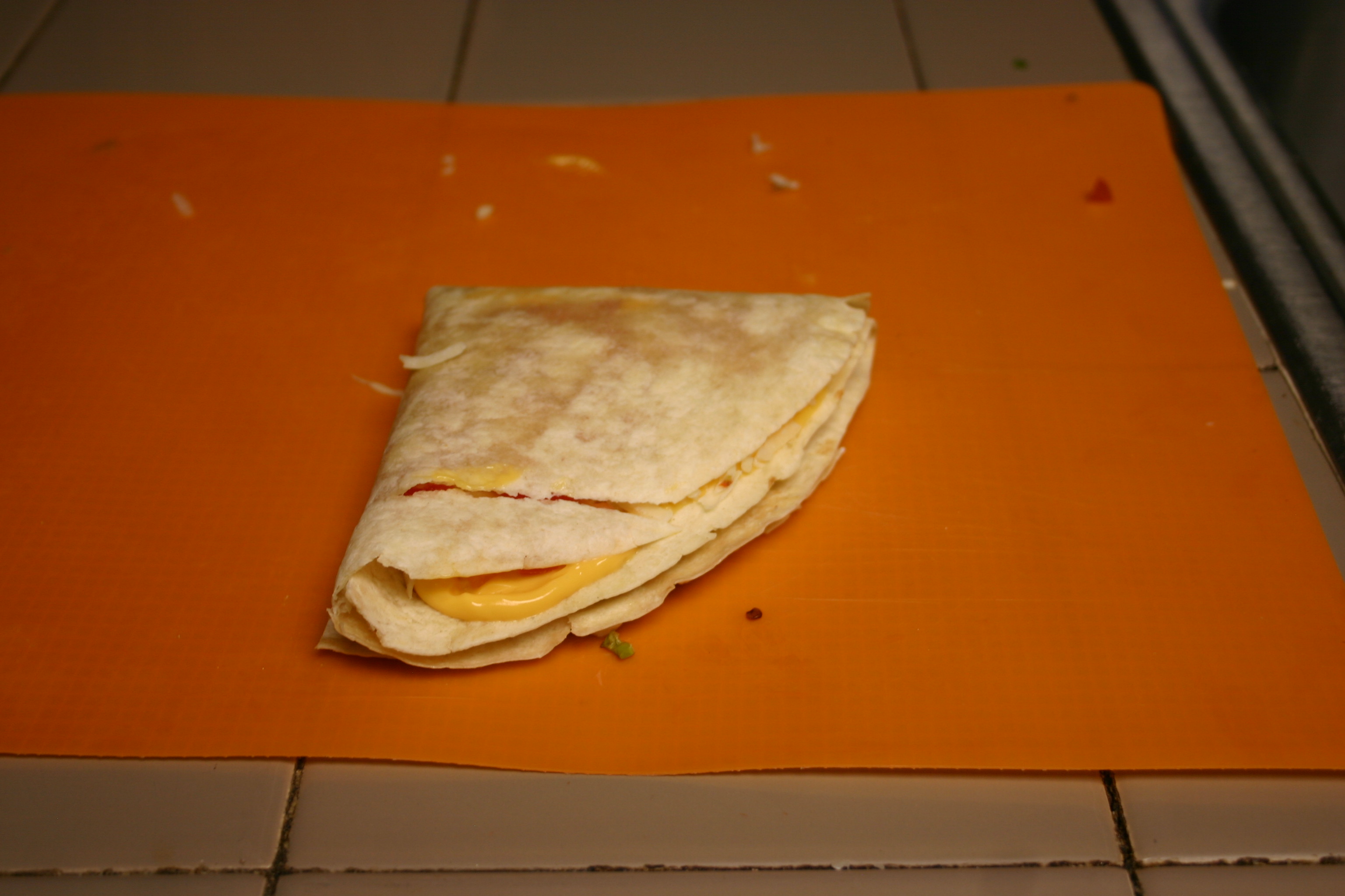 Working with 1 tortilla at a time, cut a slit in the tortilla just to the center. Spread beans on a quarter of the tortilla, just to the left of the slit, fold over. Spread Nacho Cheese on a quarter of the tortilla over the bean fold. Scatter Pepper Jack Cheese over the Nacho Cheese. DO NOT fold yet. Scatter tomatoes on the third quarter, alongside the cheese.