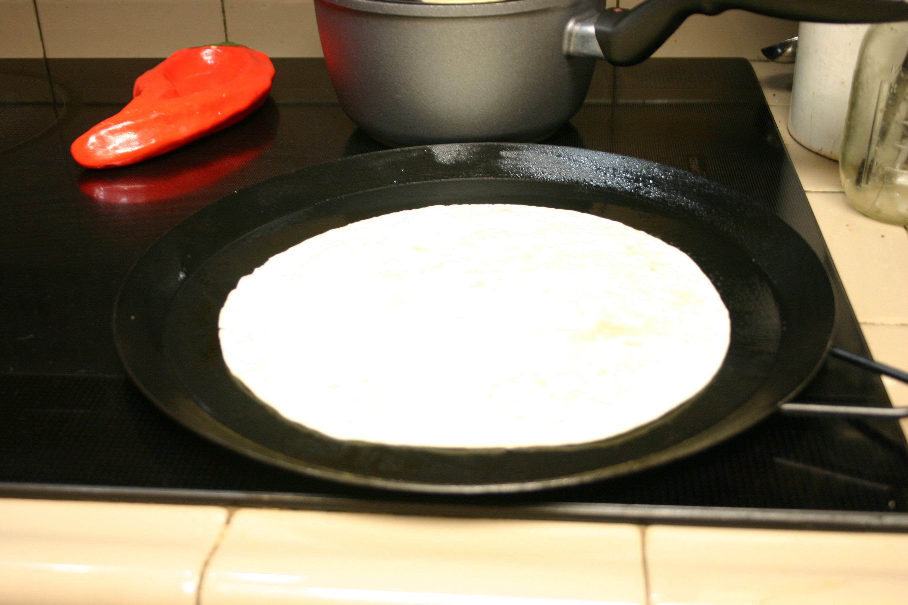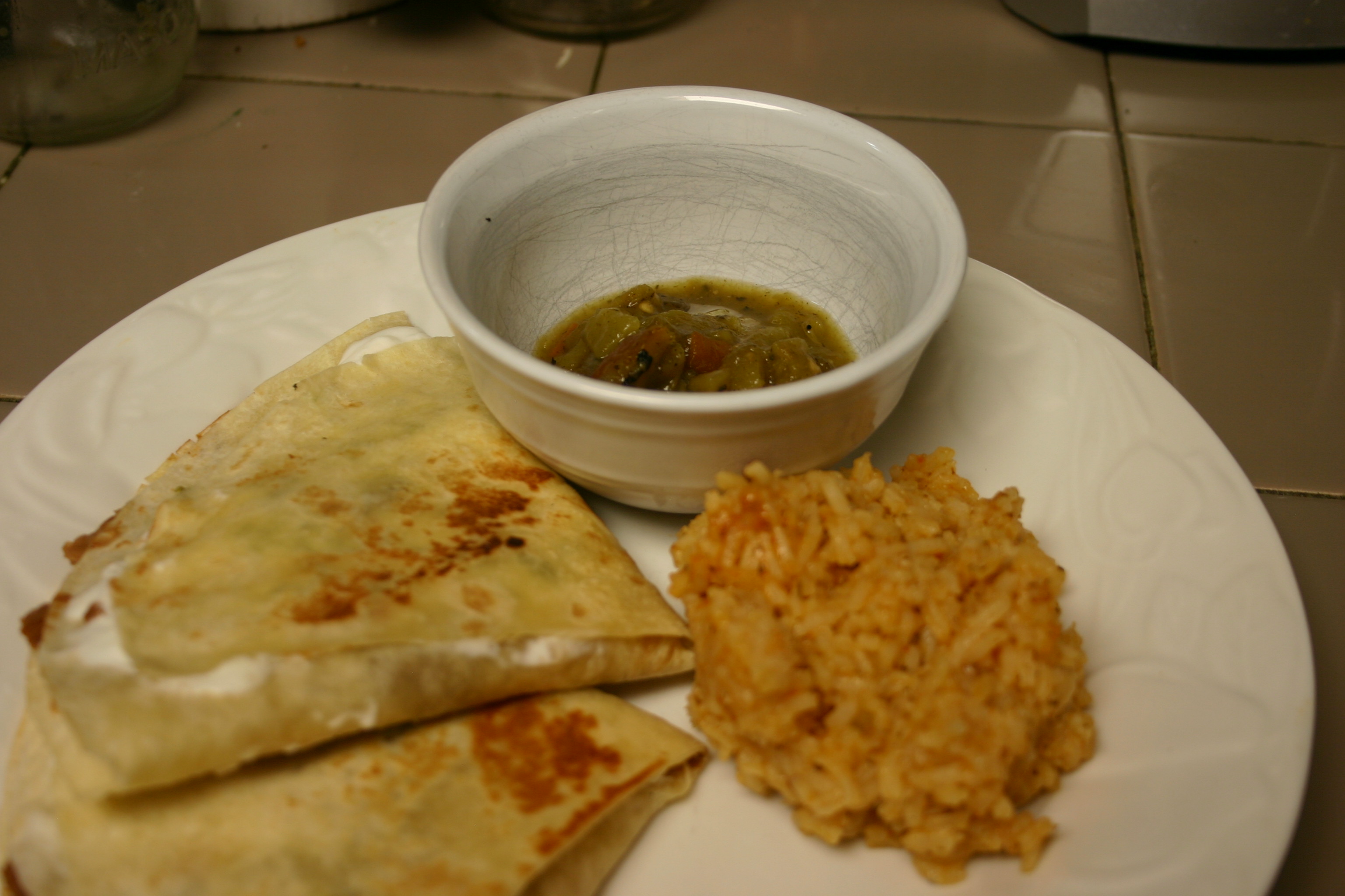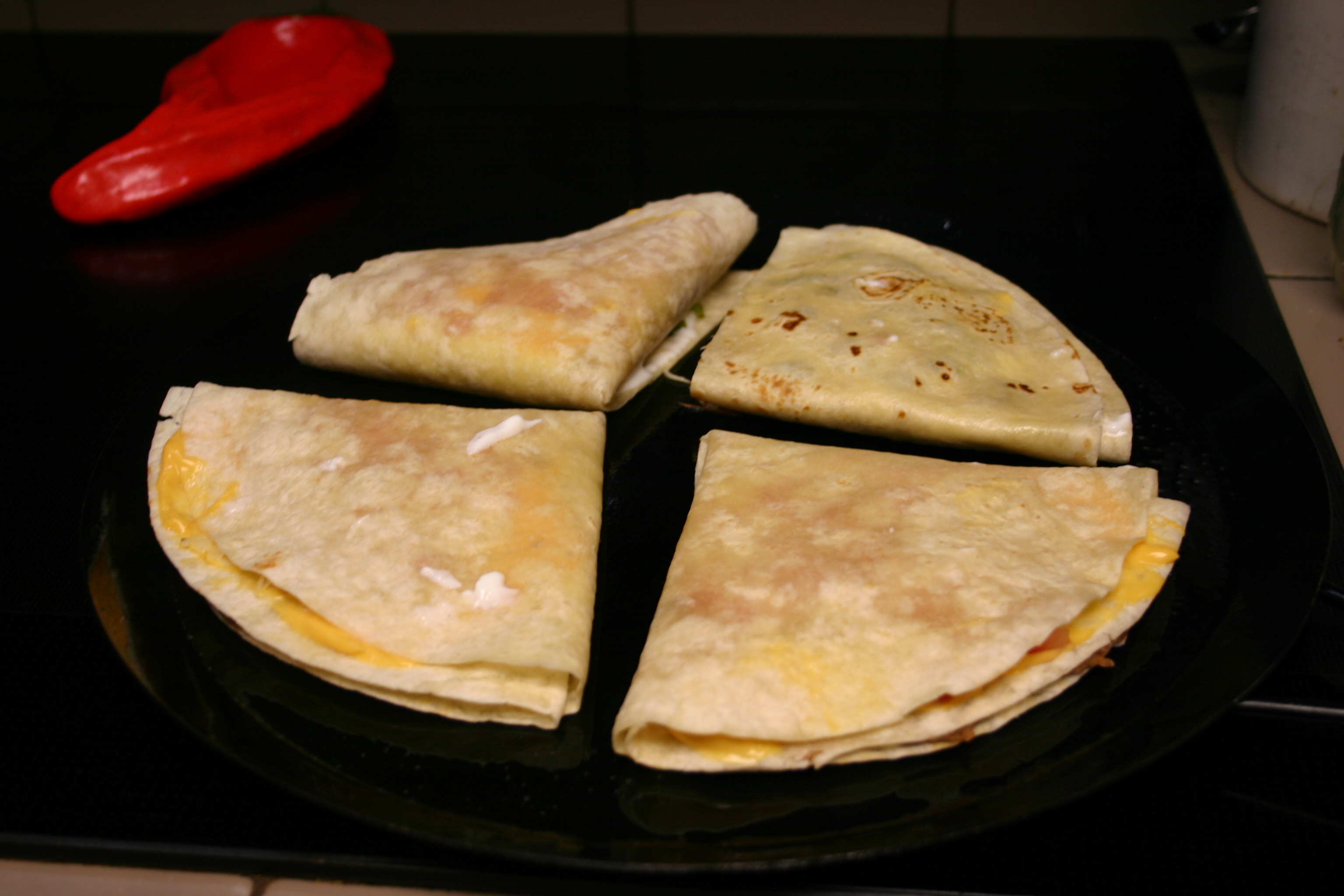 Fold cheese over the tomatoes. Finally, spread sour cream on the remaining quarter. Scatter roasted peppers over the sour cream, fold the entire quesadilla over onto the sour cream quarter. Set aside, repeat until all the tortillas have been filled and folded.