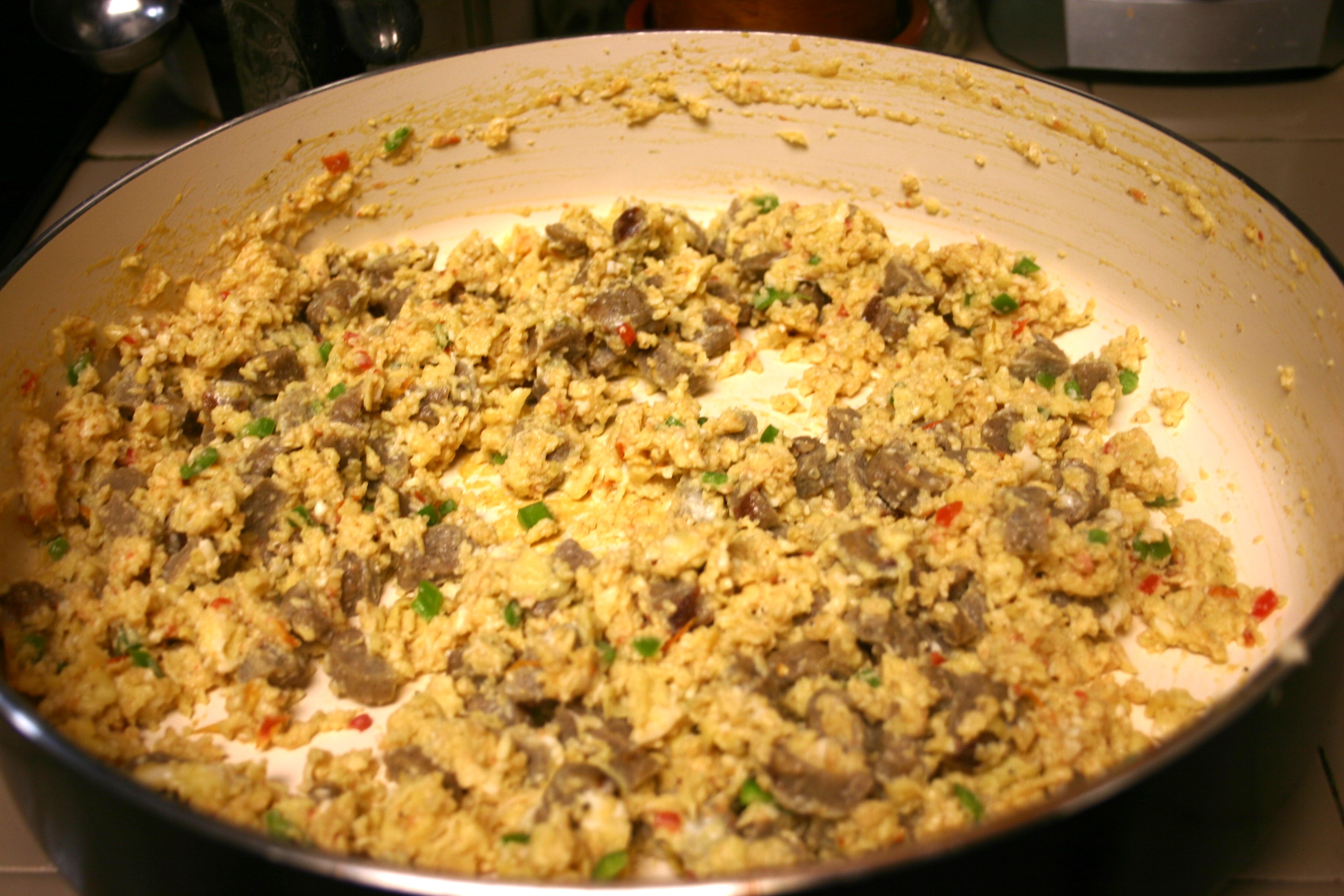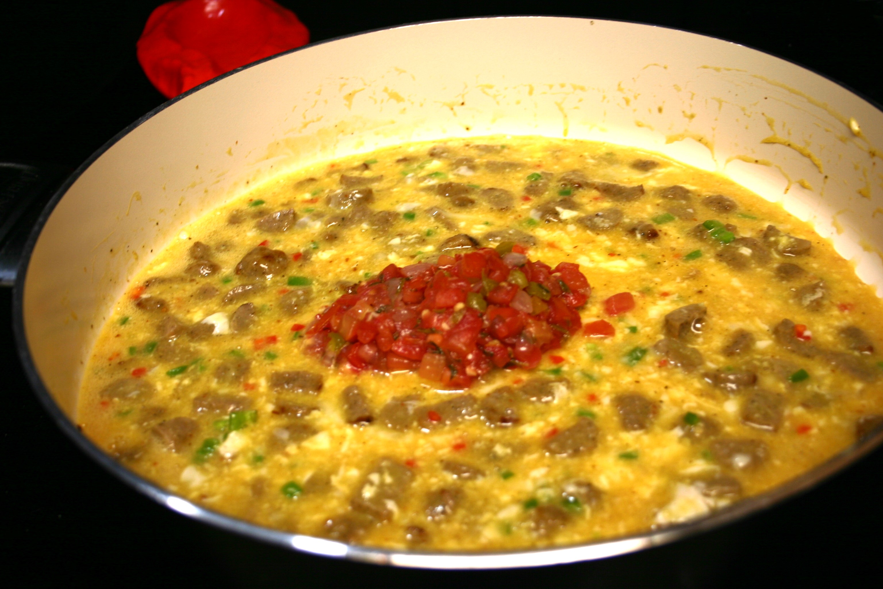 In a large skillet, sauté peppers until just beginning to soften. Add eggs, let cook for just a minute. Add diced sausage, scramble into the eggs. With a slotted spoon, drain salsa of excess liquid. Add to the skillet. Scramble salsa into the eggs. Continue to cook until eggs are cooked through but not too dry. Remove skillet from heat during the final few minutes of cooking to better control finished eggs.