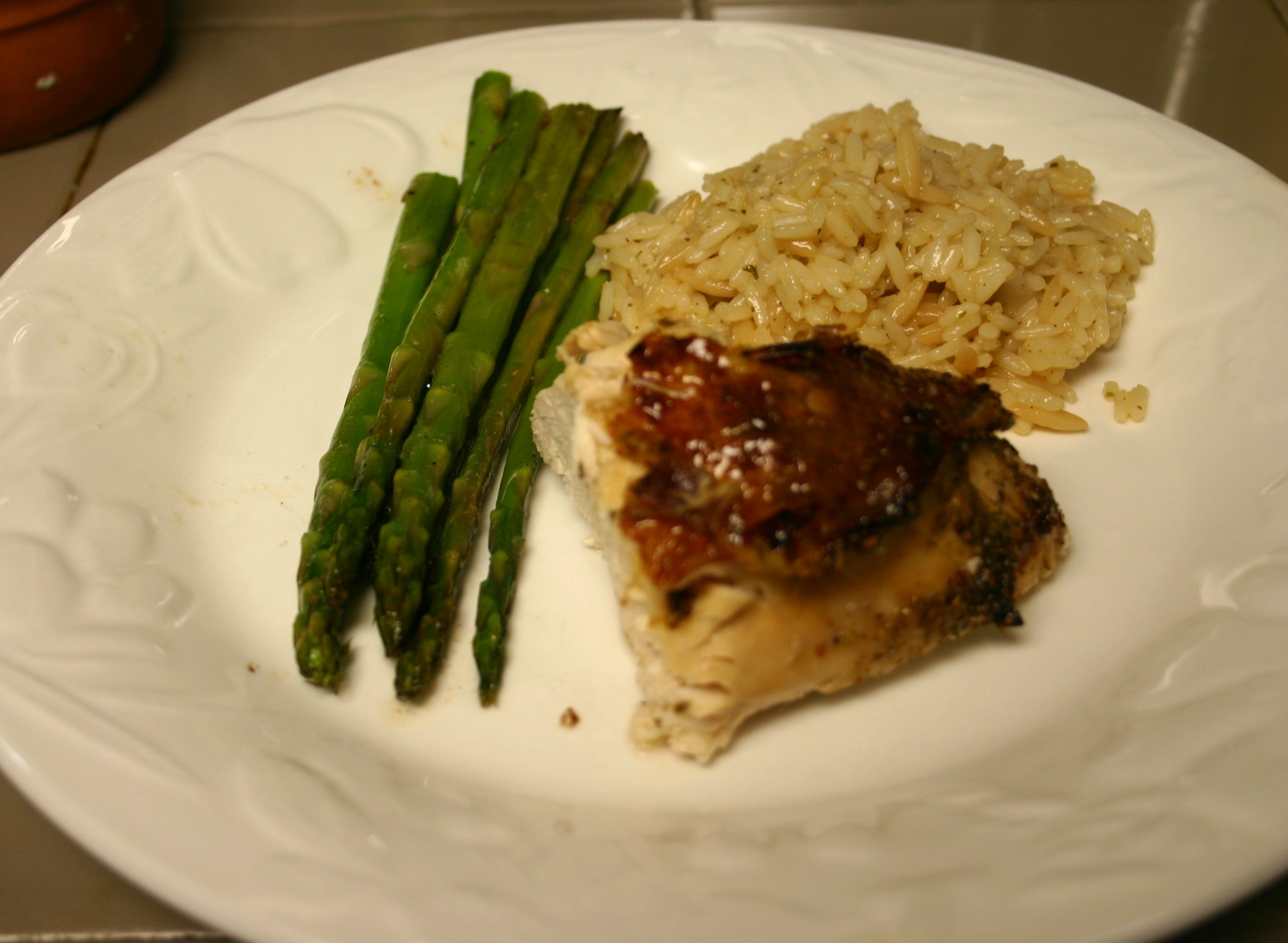This sweet yet succulently moist chicken pairs nicely with a Rice Pilaf and Oven Roasted Asparagus.