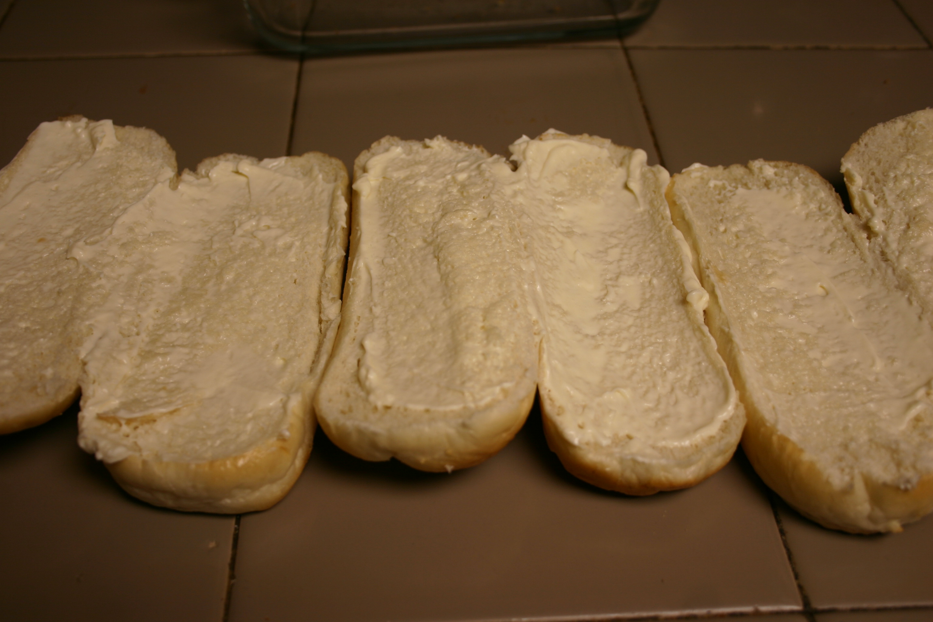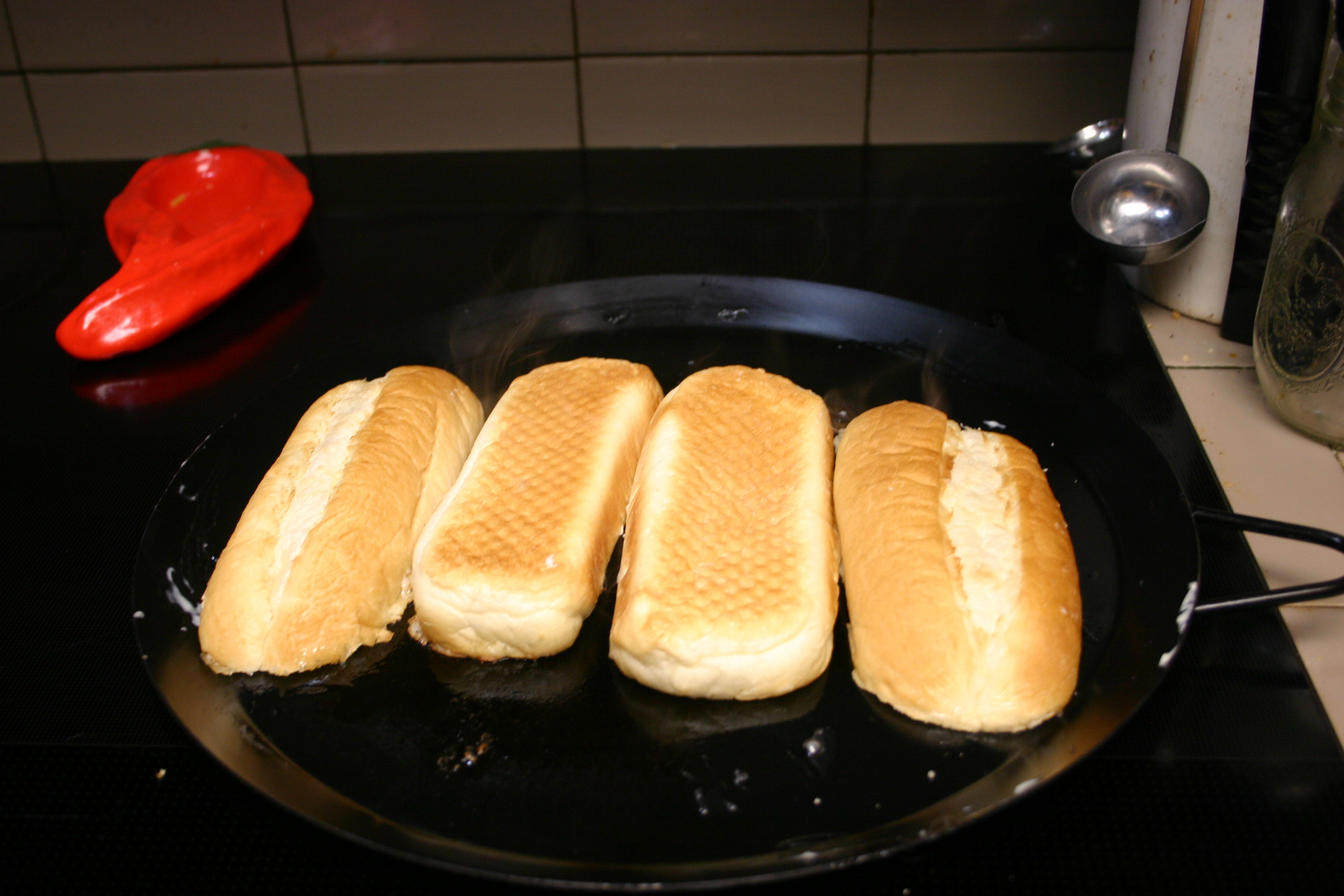 Split steak rolls. Brush the inside of each roll with about a tablespoon of mayonnaise. Warm a flat pan or griddle. Lightly toast rolls, mayonnaise side down.