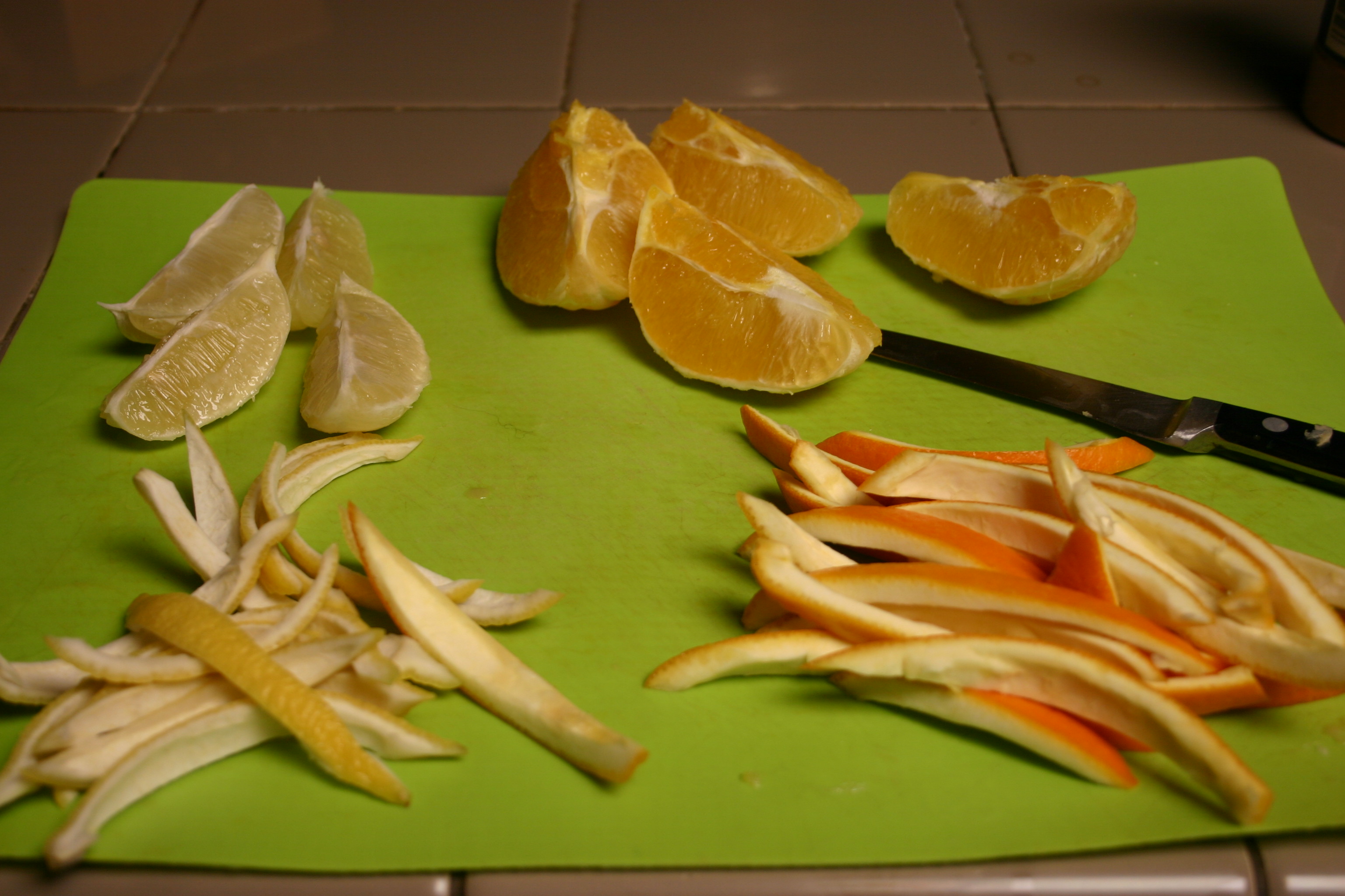 Cut lemon into quarters, remove peel from the fruit. Reserve lemon for another purpose. Cut peel into strips, set aside. Cut orange into quarters, remove peel from fruit. Reserve orange for another purpose. Cut peel into strips, set aside.
