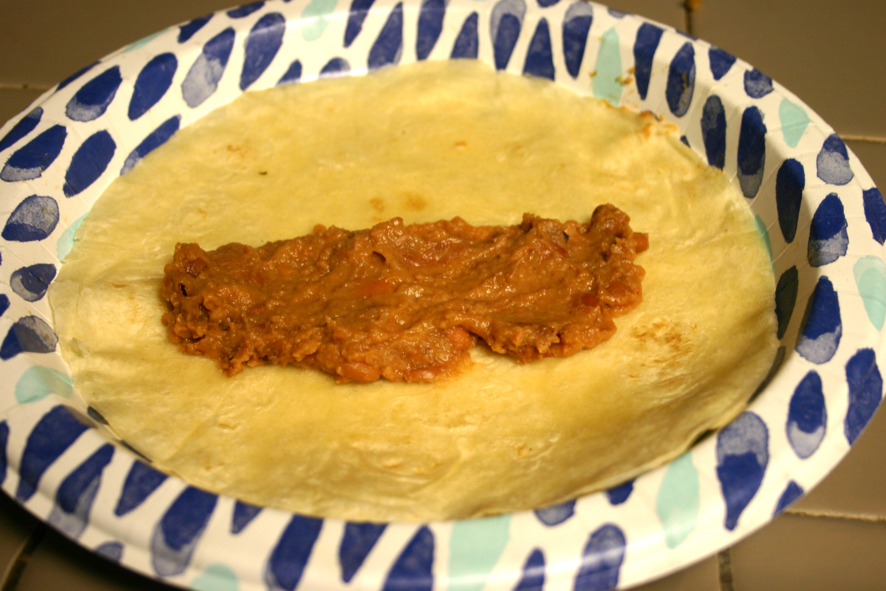 Working with one tortilla at a time, place some beans down the center of the tortilla to within about a half-inch from the edge. Top beans with rice. Tuck ends inward, tightly rolling the tortilla around the filling to encase filling completely. Place burrito seam-side down in the prepared casserole dish. Repeat until all the burritos have been made.