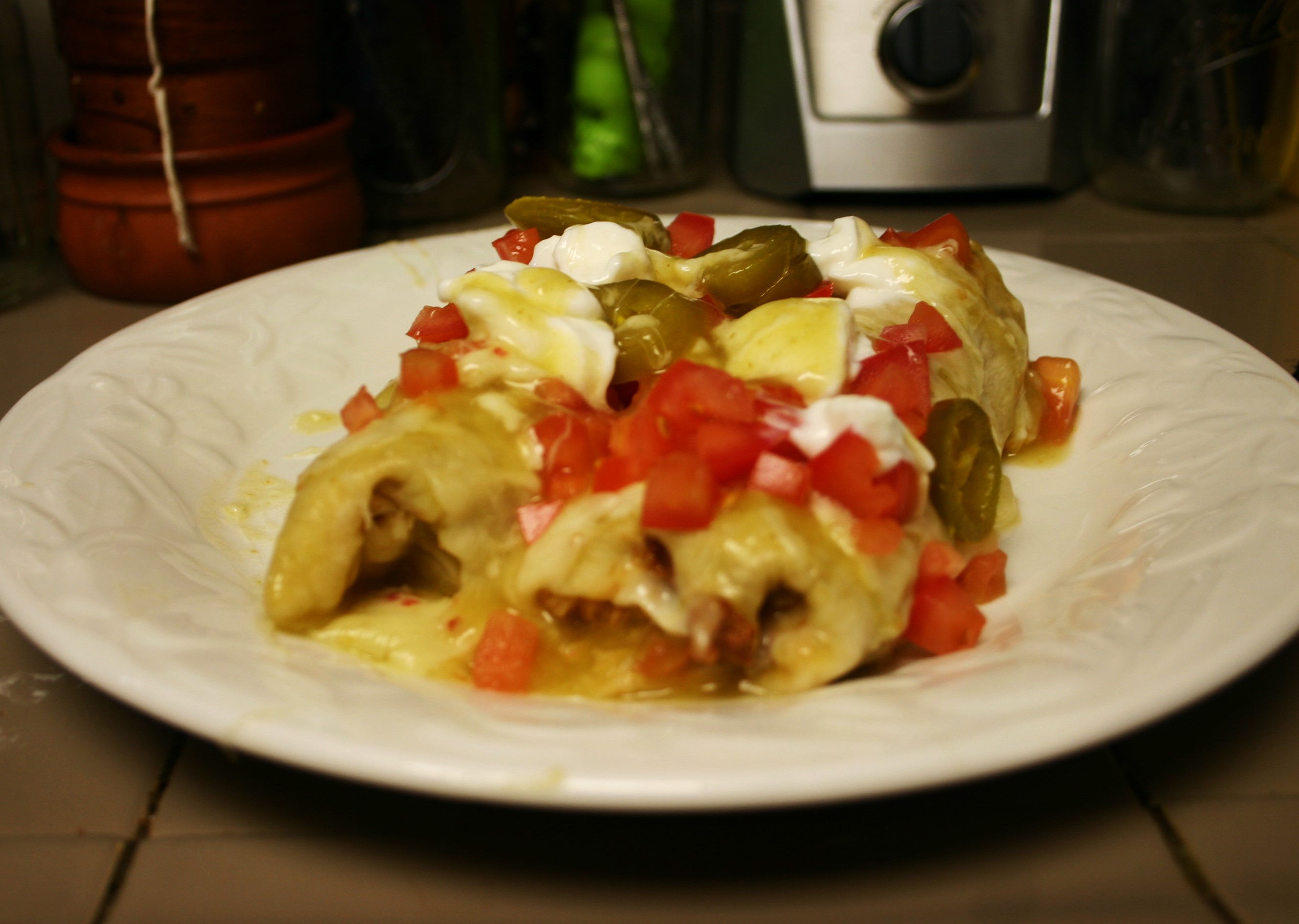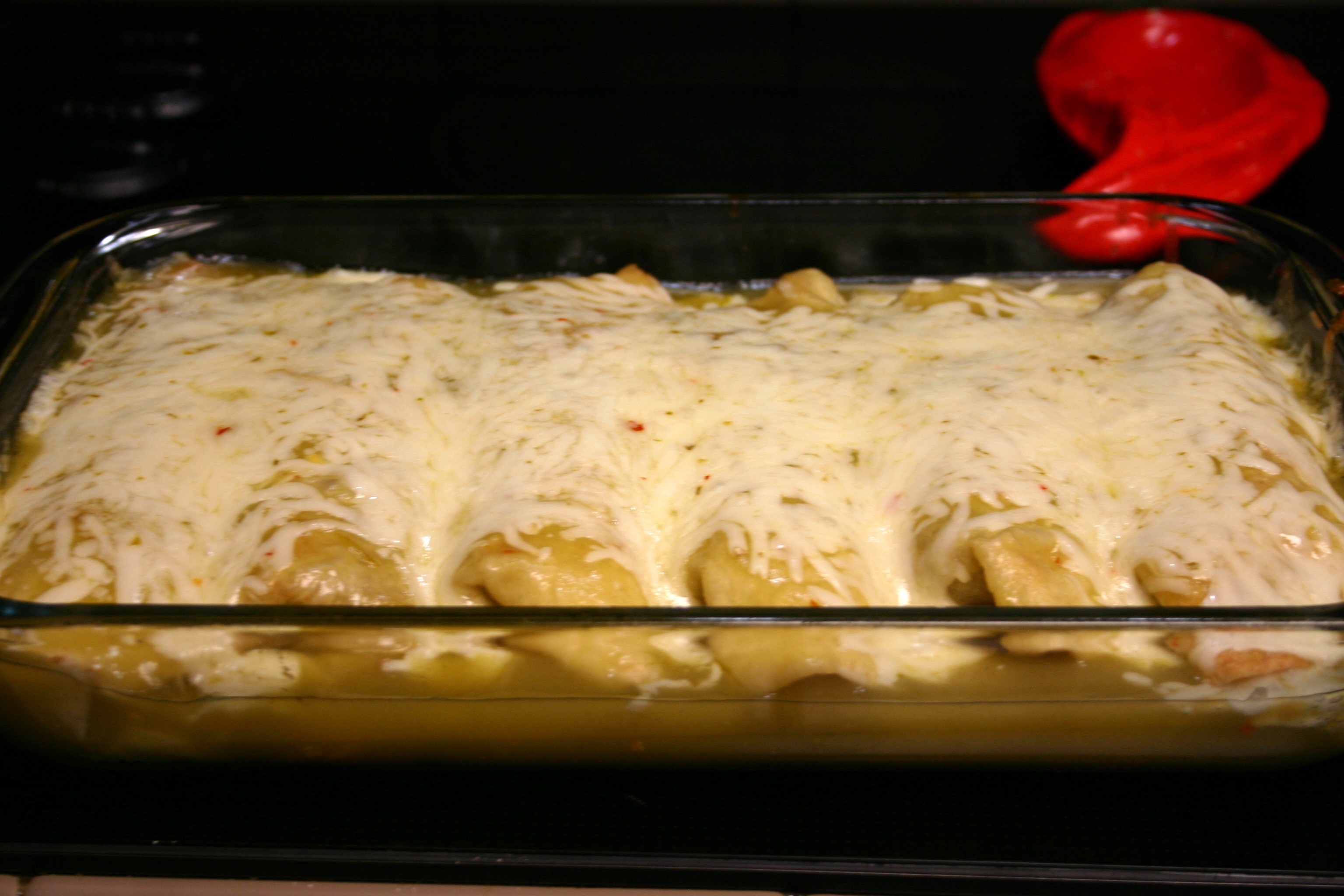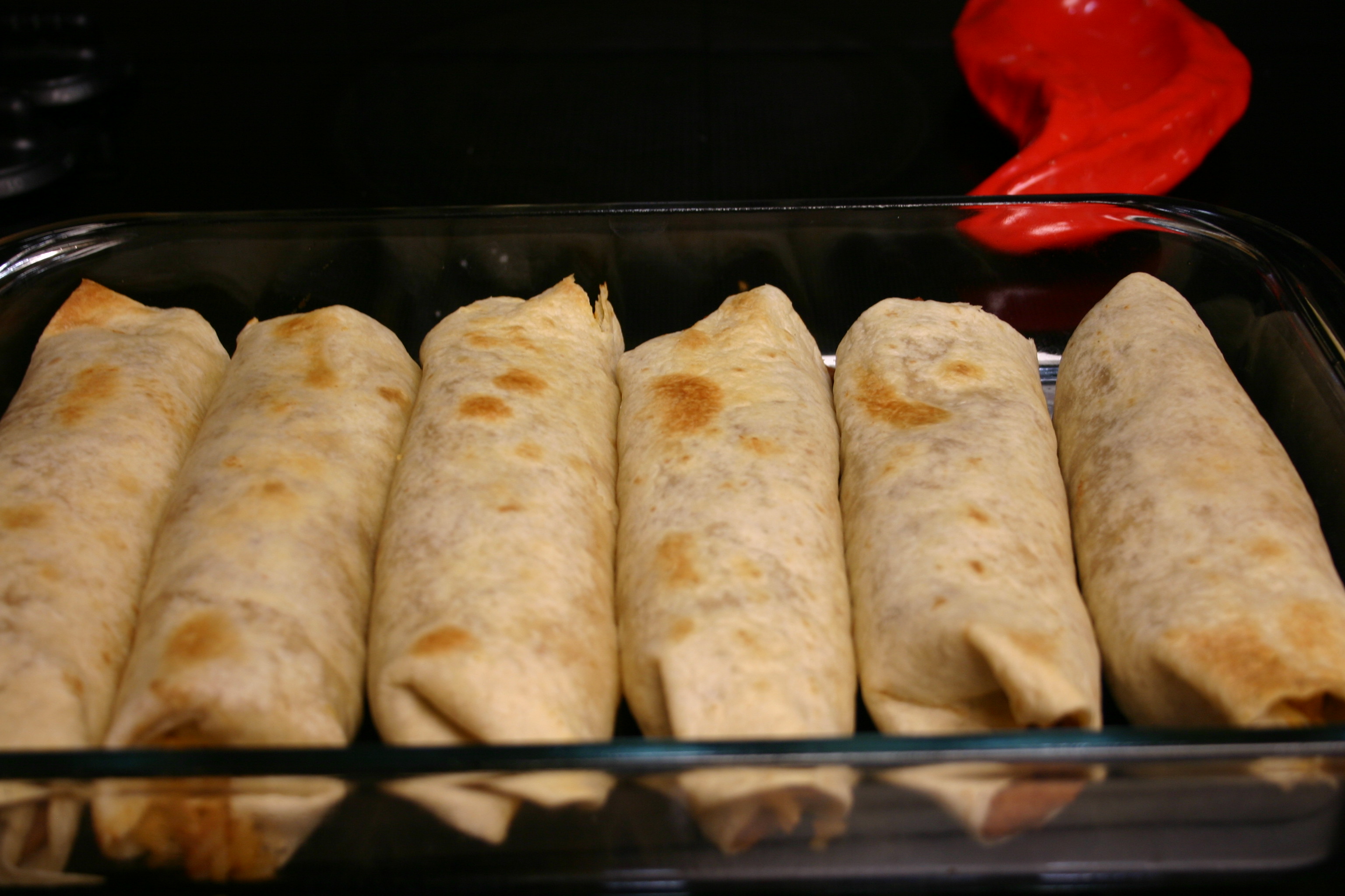 Place in the heated oven to bake for about 15 minutes, just until tortilla is beginning to brown. Remove from oven, ladle enchilada sauce over the burritos. Top with cheese. Return to the oven, bake until the cheese has melted and the sauce is bubbling.