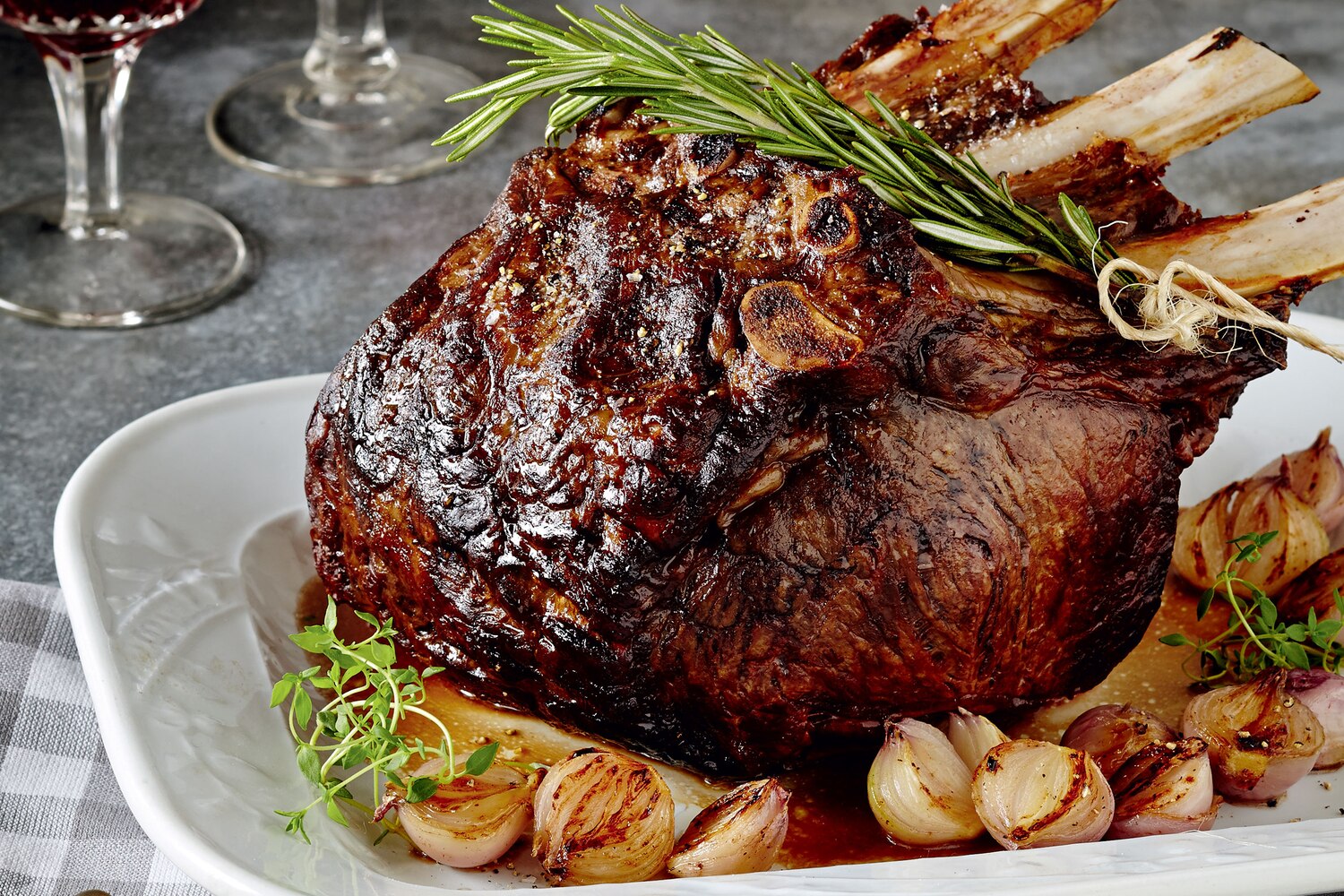 For a dramatic presentation, place stand roast rib bones up on a serving platter. Garnish with rosemary and scatter shallots around the roast, then carve tableside. Serve with jus.